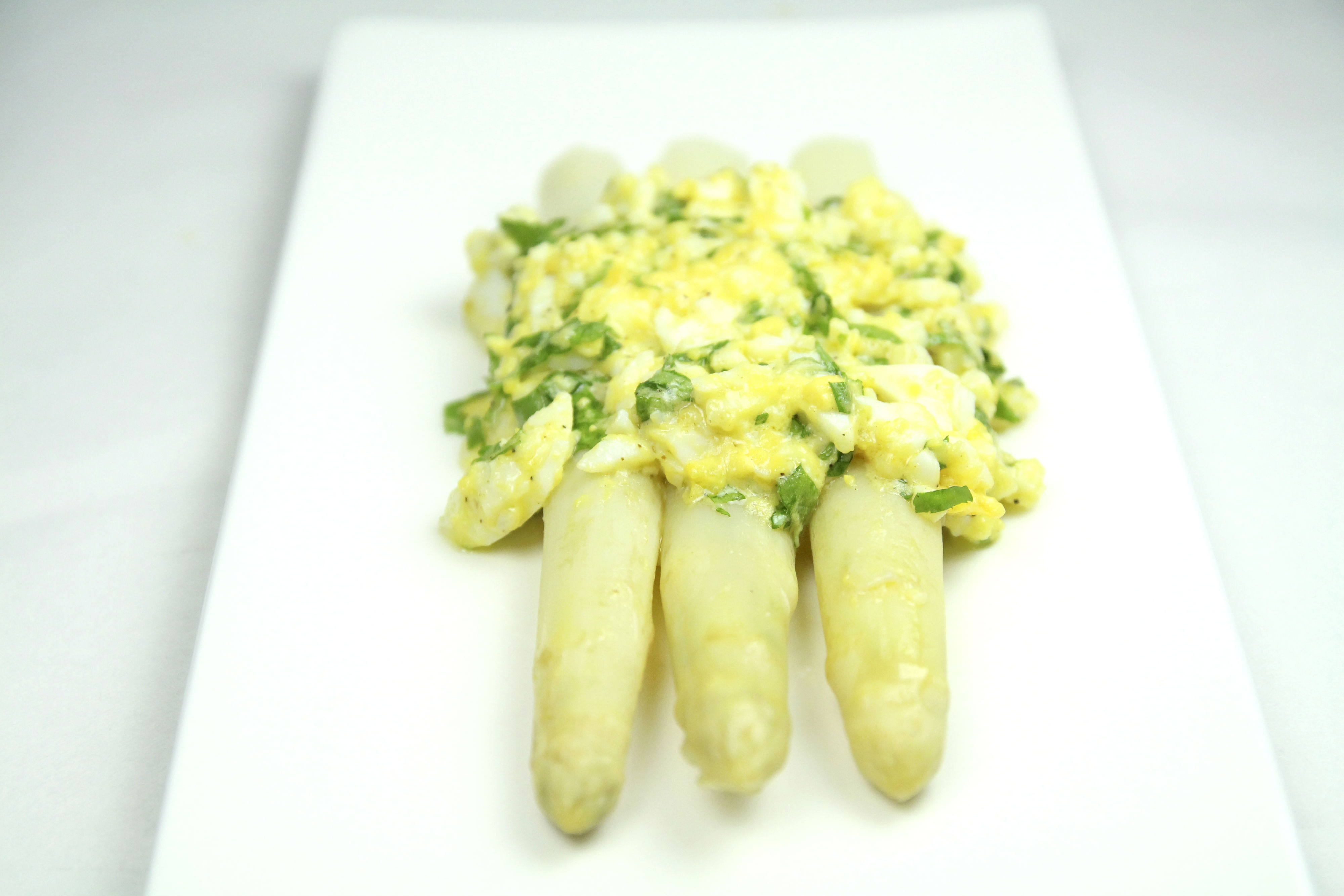 Dressez vos asperges tièdes-chaudes sur assiettes et nappez le tout du mélange œuf-persil-beurre.