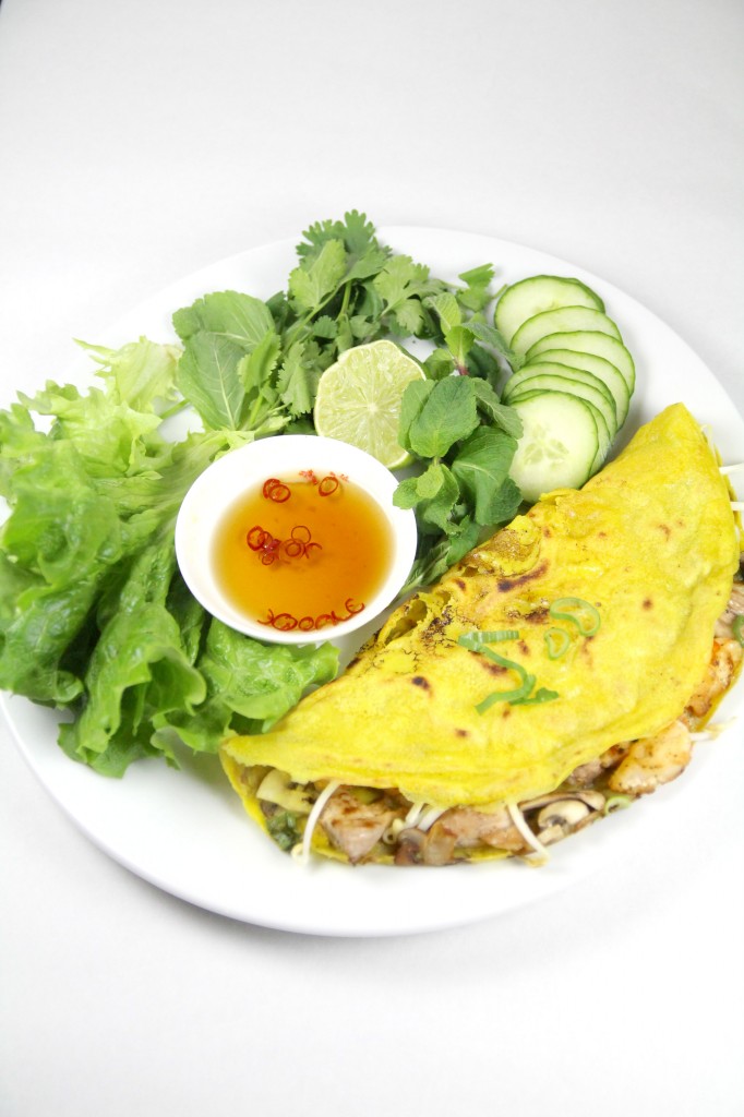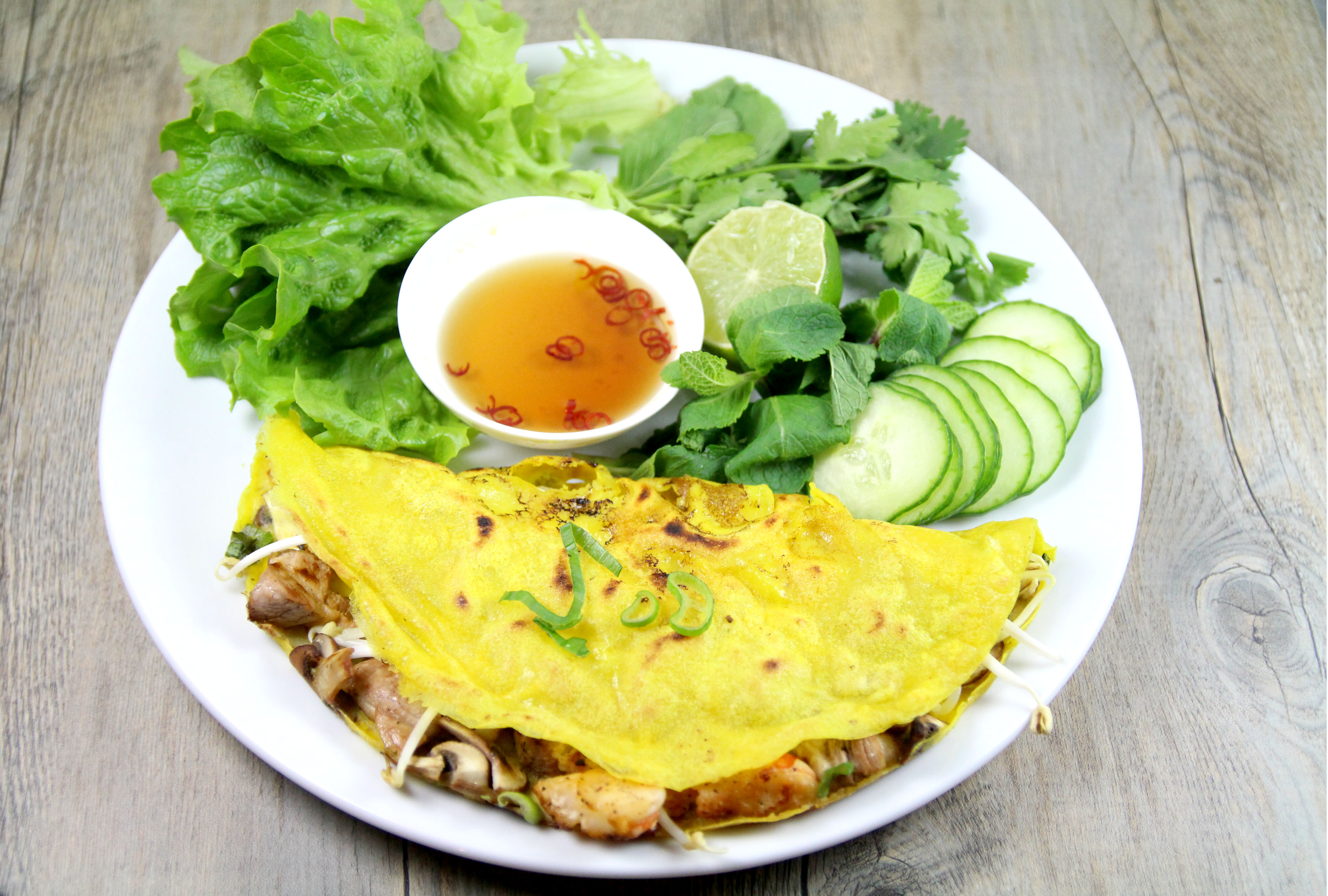 Comme vous vous en doutez direction le Vietnam aujourd’hui. Je sais ce que vous pensez mais ce n’est pas une omelette (la couleur jaune vient de l’utilisation de curcuma). En feuilletant le livre d’Andrea Nguyen, « Into the Vietnamese kitchen », je suis souvent passé devant cette recette sans vraiment y faire attention. Il a fallu que qu’un collègue de travail  d’origine Vietnamienne me parle de ce plat pour que je m’y intéresse et j’ai bien fait. En effet, c’est vraiment une explosion de saveurs et de textures en bouche…un régal. Pour faire simple, il s’agit d’une crêpe fine et croustillante garnie de crevette, porc, champignons, haricots germés, oignons. Vous prenez un morceau de cette crêpe, quelques herbes fraîches, un morceau de concombre et vous enrouler le tout dans une feuille de salade que vous tremper dans une sauce yummy yummy….bref un régal. Même si elle demande un peu de préparation cela vaut vraiment la peine, vos invités vont adorer! Allez on relève ses manches…c’est parti!