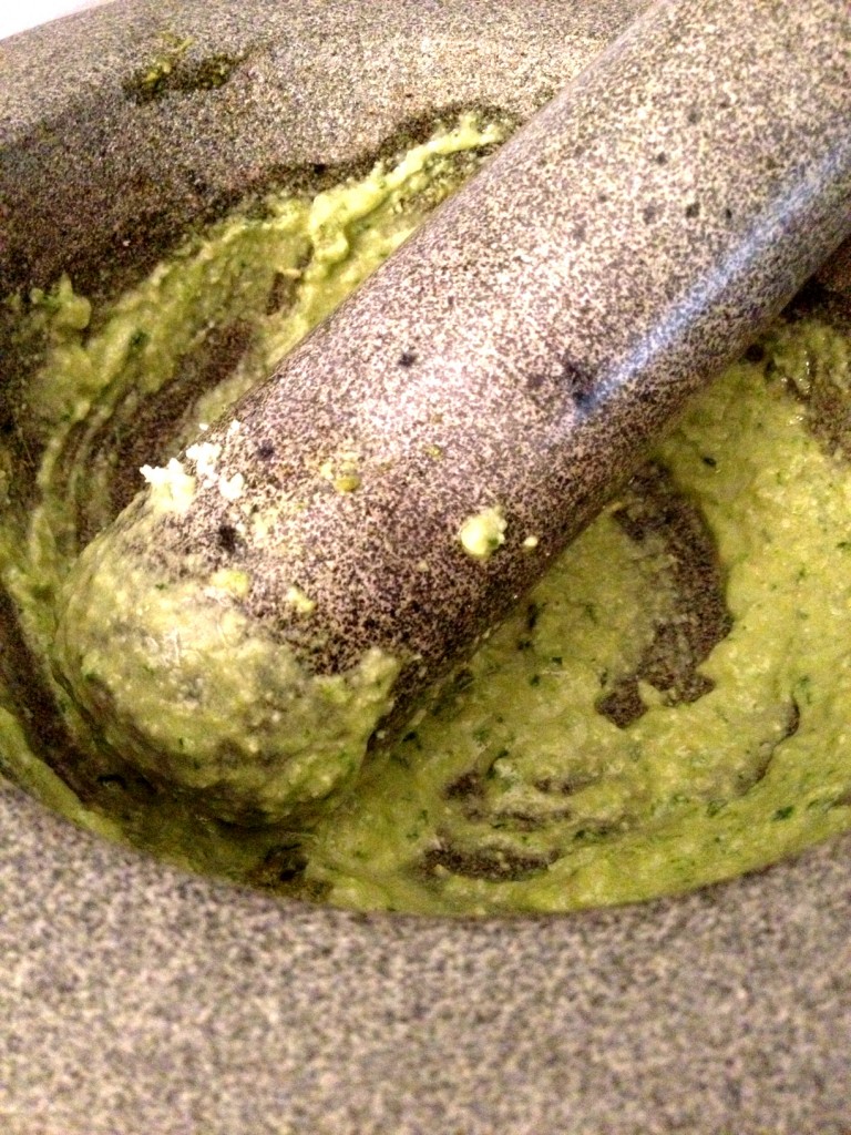 Dans un mortier, écraser le basilic et les pignons. Une fois que vous avez obtenu un mélange homogène, ajouter le jus d’un demi citron, l’huile et le parmesan. Malaxer à nouveau. Rectifier au cas où avec l’huile d’olive pour obtenir une « purée » homogène. Si vous utilisez un mixeur mettre tous les ingrédients en même temps.