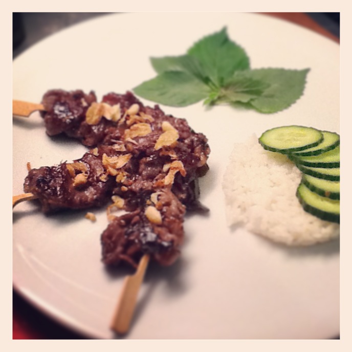 Aujourd’hui on reste au Vietnam avec une de mes recettes favorites (je sais il y en a beaucoup) de brochettes de boeuf grillé à la citronnelle. Ce que j’aime particulièrement dans cette recette c’est l’arôme frais d’agrumes/citron qu’apporte la citronnelle et les feuilles de citronnier. Par contre je dois vous avouer que j’ai eu un véritable dilemme pour choisir la recette entre celle du livre d’Andrea Nguyen « into the Vietnamese kitchen » et le livre « Paris-Hanoi ». Malgré que la liste d’ingrédients soit un peu plus longue, j’ai opté pour celle du livre Paris-Hanoi et ce pour un détail, pour la présence de feuille de lime (citronnier) qui je pense apporte beaucoup à la recette. Si vous utilisez des feuilles de combawa je vous conseille d’en mettre un peu moins car c’est assez puissant comme goût. Je vous avoue que j’ai légèrement adapté la recette à mon goût. Maintenant à vos baguettes, prêt, cuisinez!