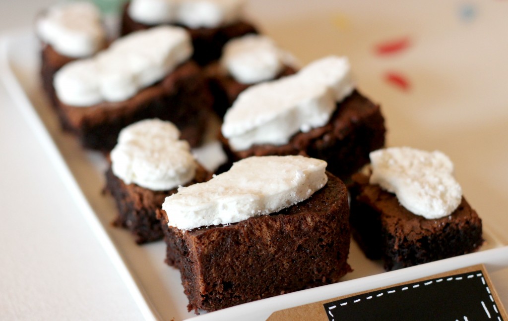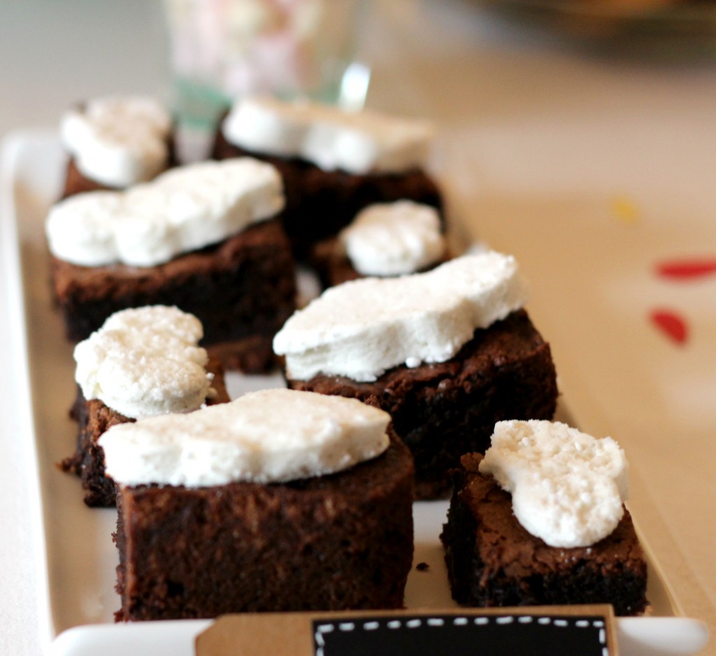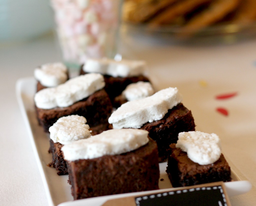 Pour coller au thème « nuage » de ma Sweet Table j’ai ajouté sur le dessus des guimauves maison que j’ai emporte-piécées! Je ne suis pas encore la reine de la guimauve mais elles étaient pas trop ratées non plus!!