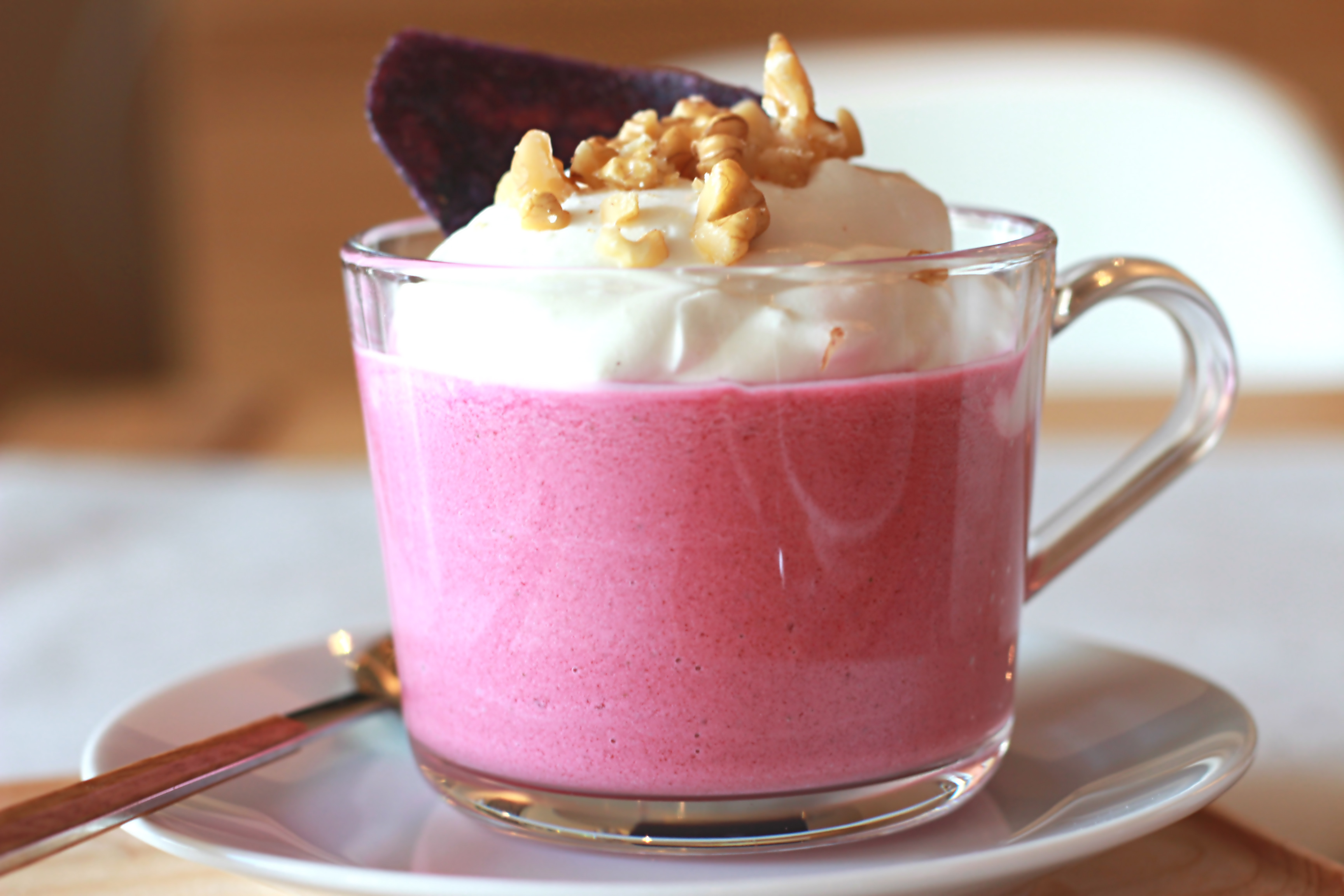 ← Cappuccino de betteraves, crème fouettée à la feta et noix