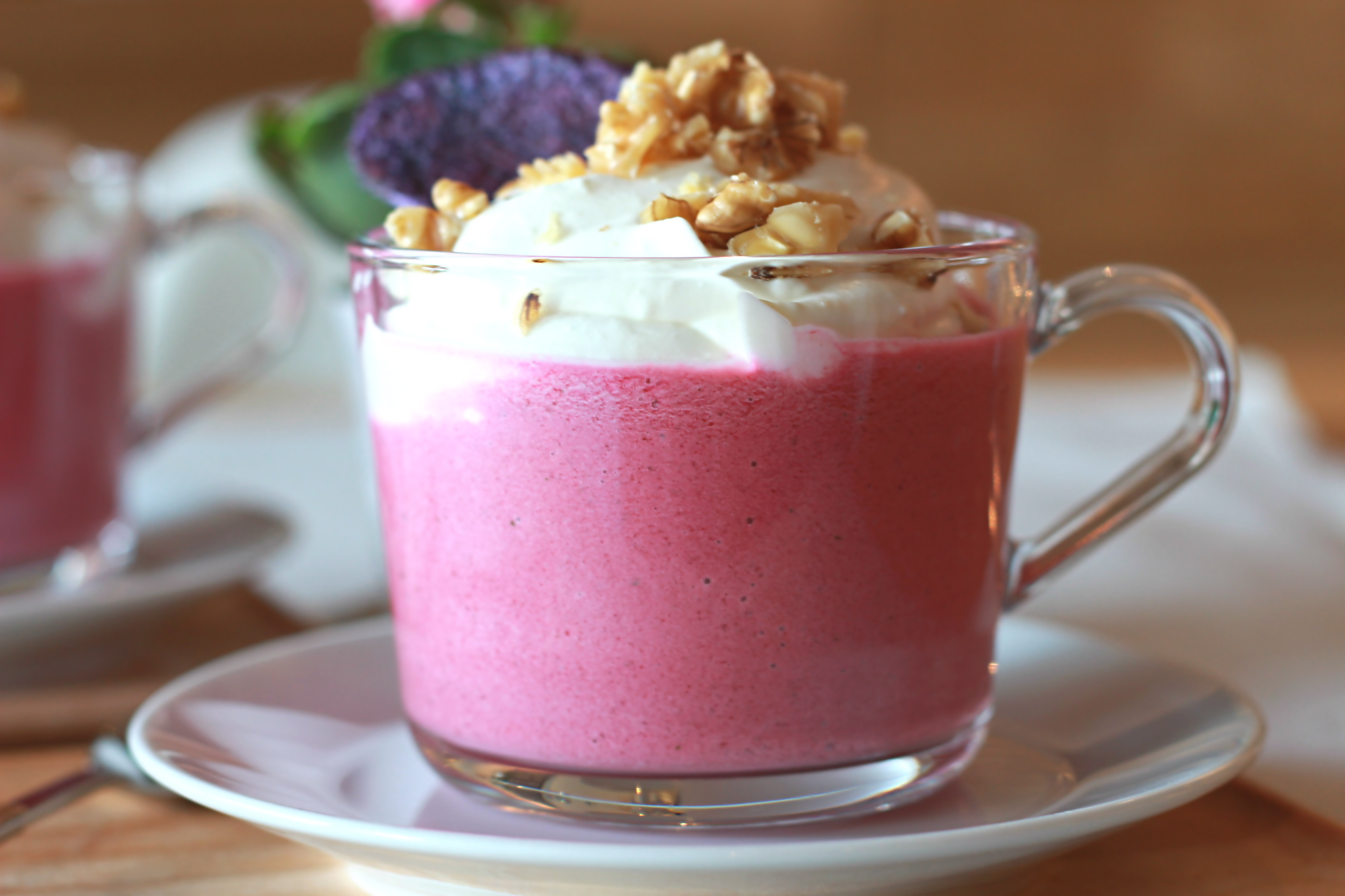 ← Cappuccino de betteraves, crème fouettée à la feta et noix