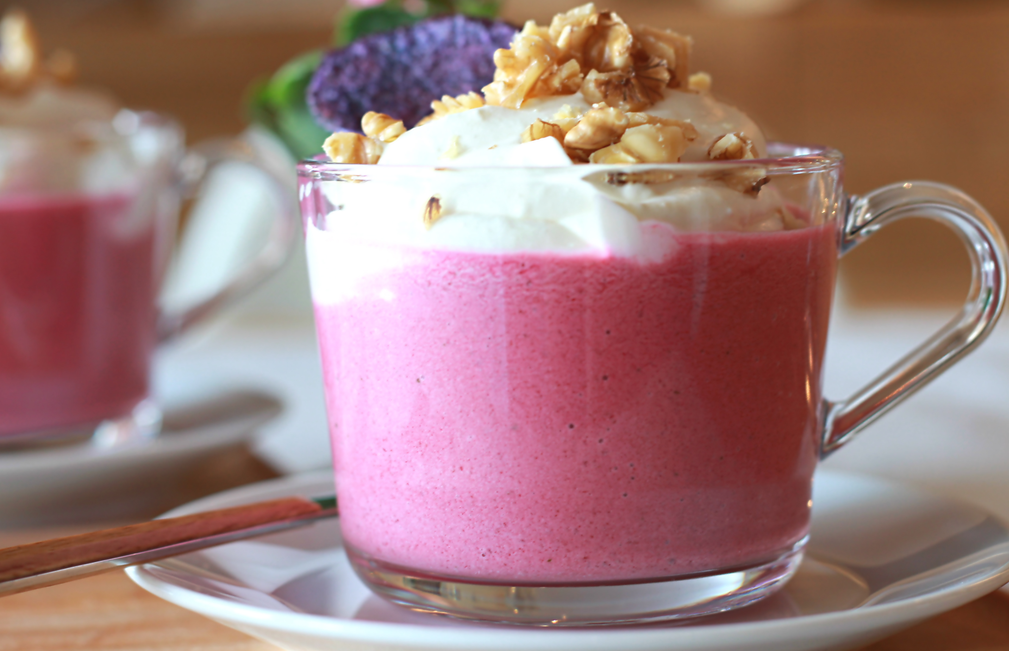 ← Cappuccino de betteraves, crème fouettée à la feta et noix
