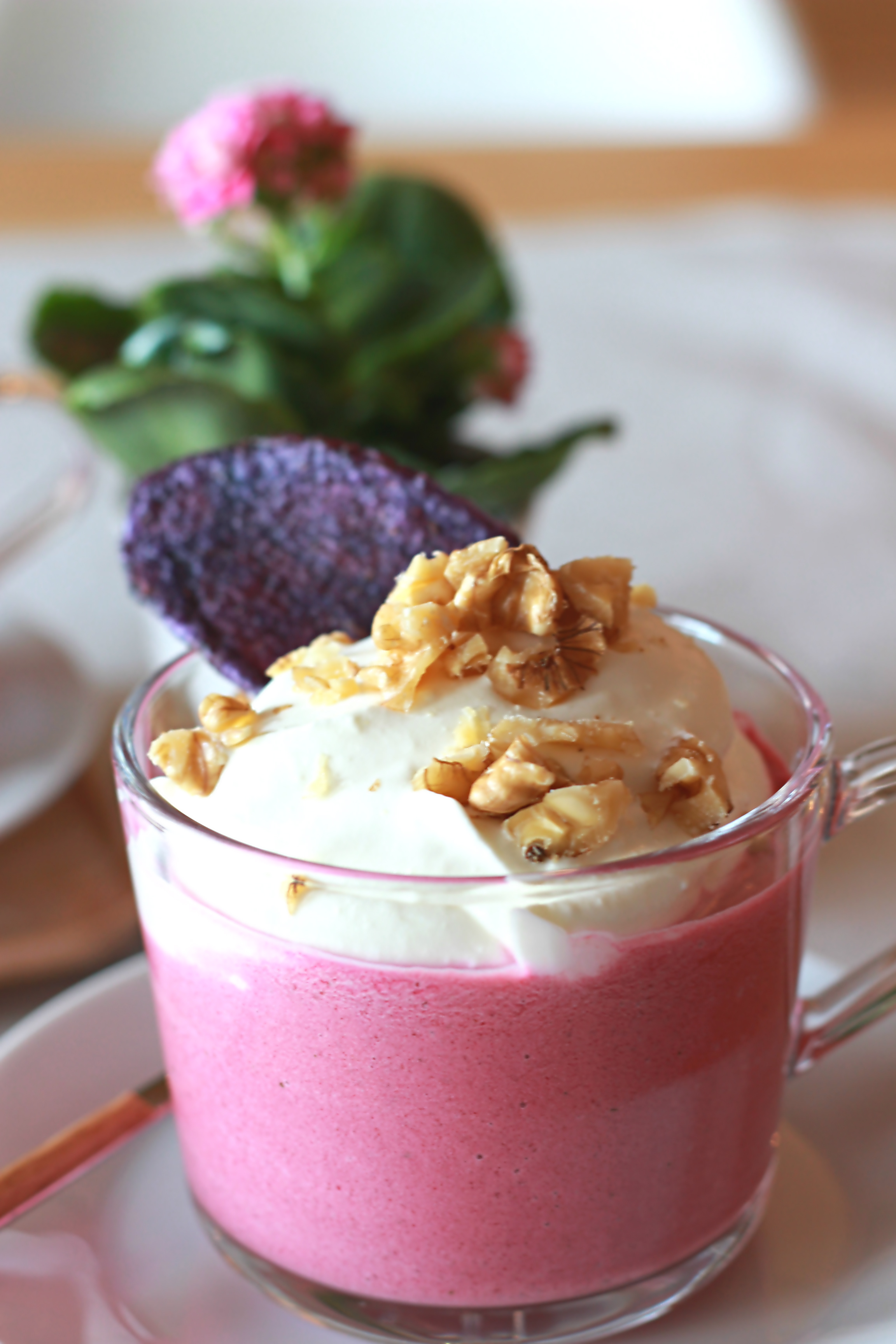 ← Cappuccino de betteraves, crème fouettée à la feta et noix