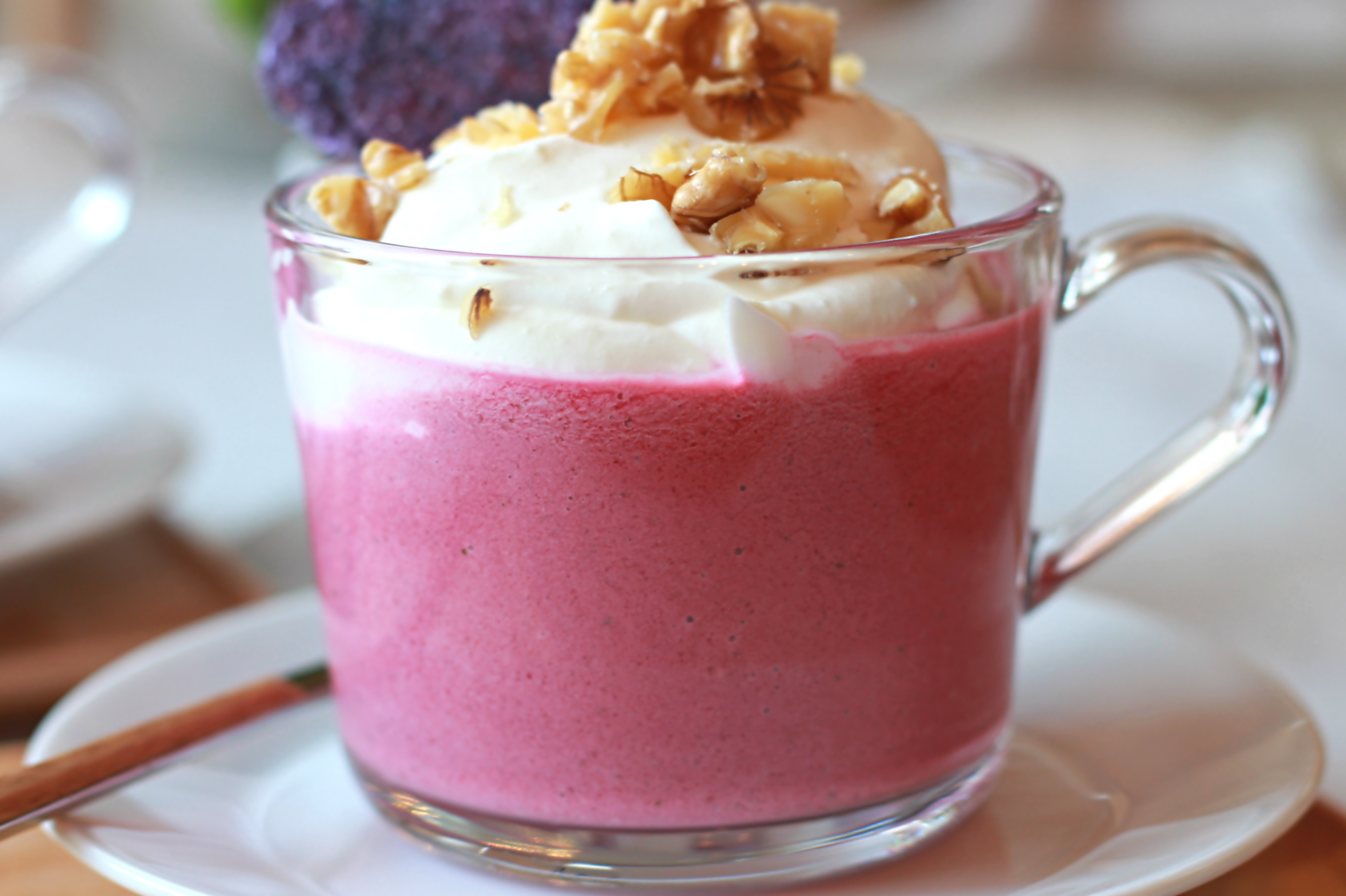 ← Cappuccino de betteraves, crème fouettée à la feta et noix