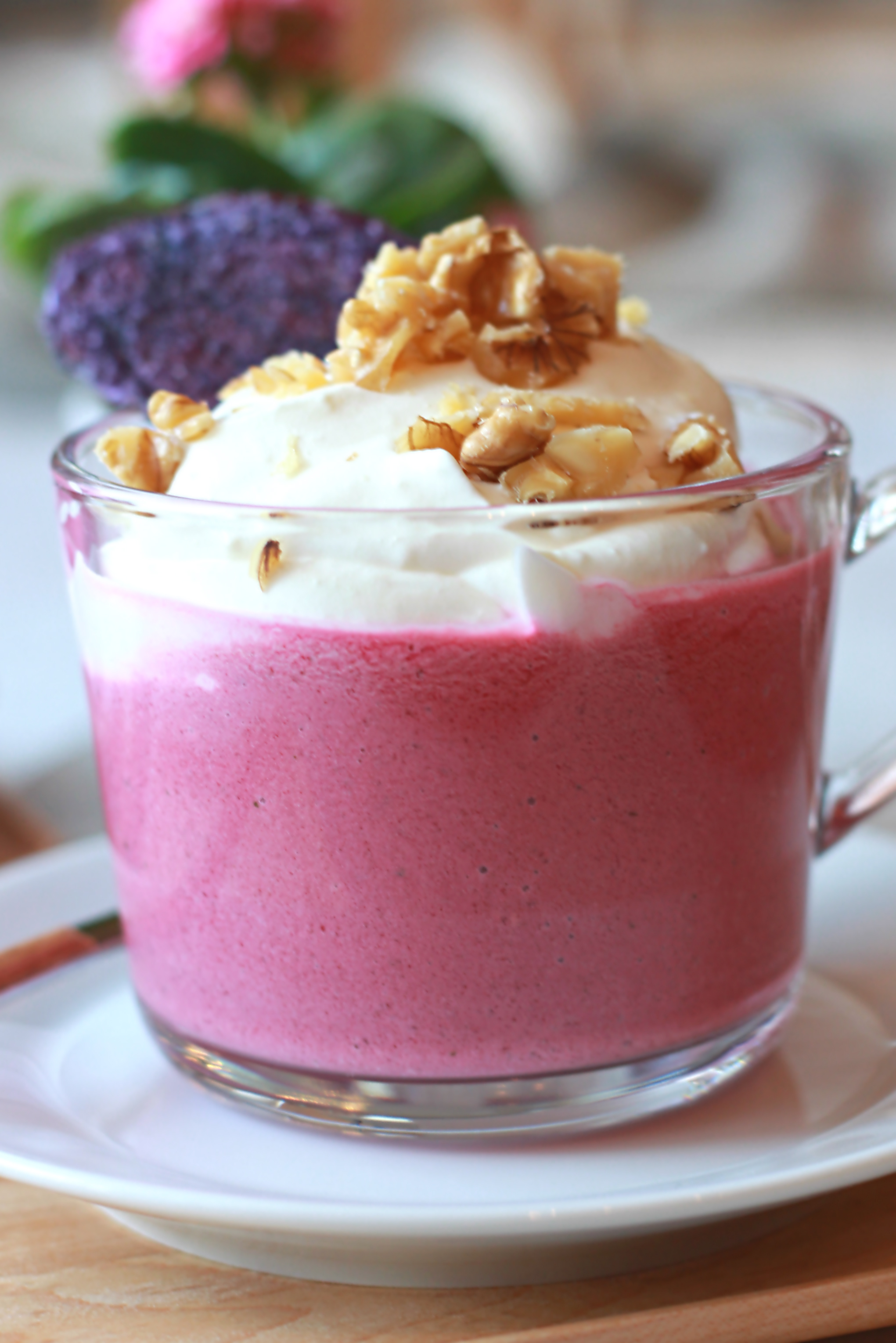 ← Cappuccino de betteraves, crème fouettée à la feta et noix