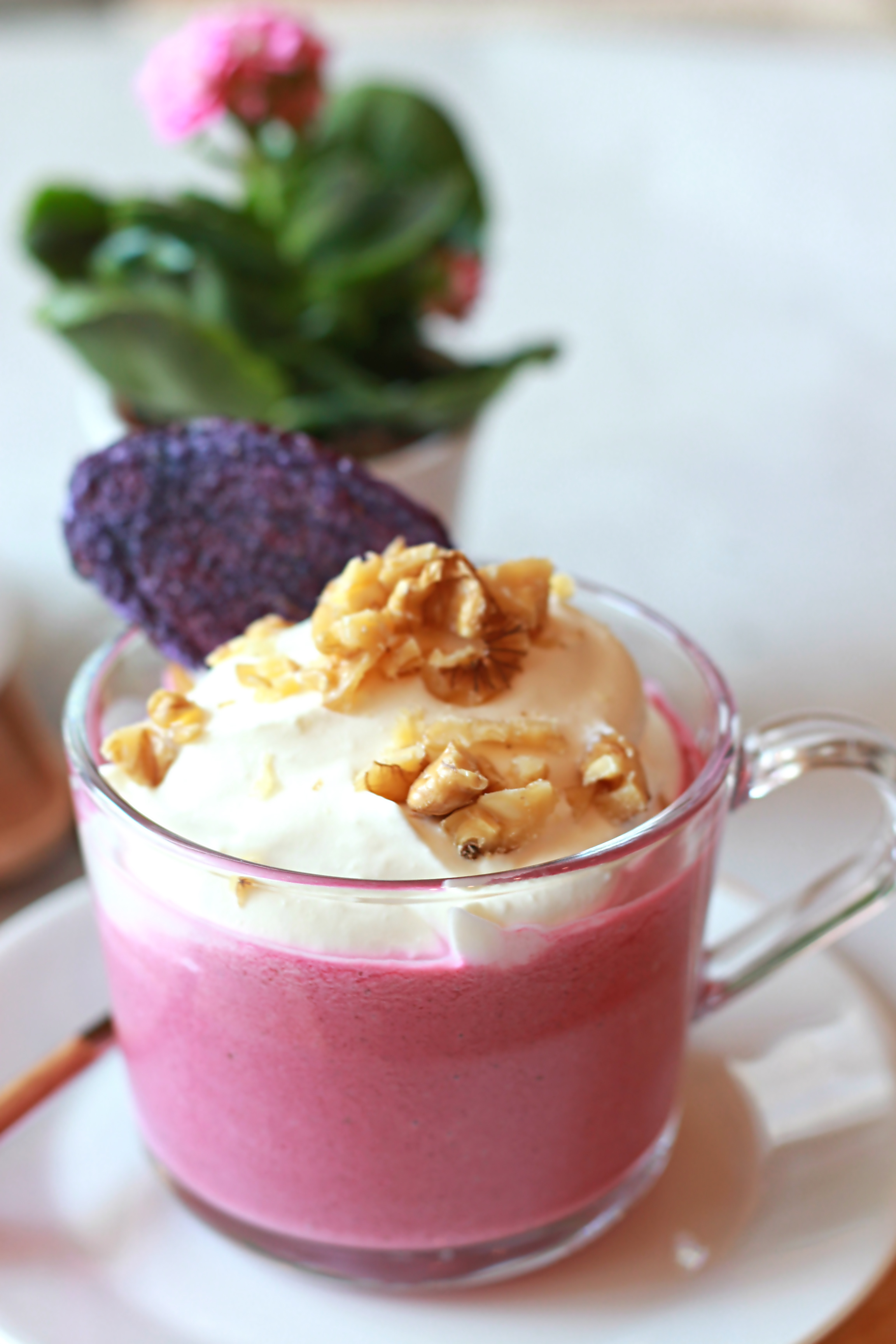 ← Cappuccino de betteraves, crème fouettée à la feta et noix