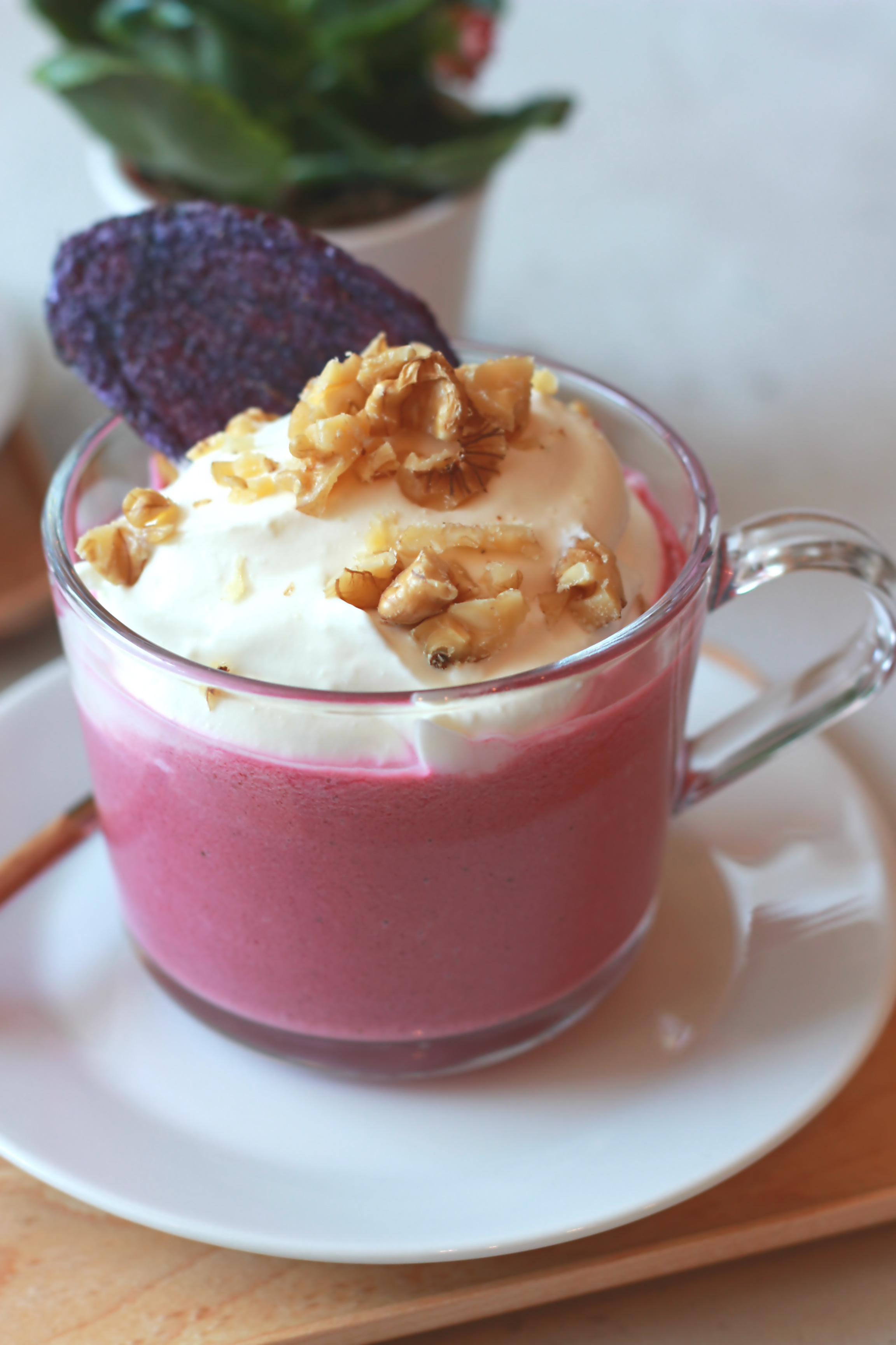← Cappuccino de betteraves, crème fouettée à la feta et noix