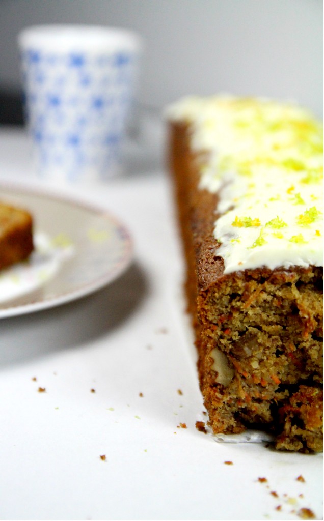 Aujourd’hui une belle recette de « carrot cake » signé Jamie Oliver et tirée de son livre « Cook ». Perso, je suis assez fan de ce gâteau au goût bien marqué dû à la présence de toutes ces épices. Je vais vous donner la recette telle quelle mais juste avant, comme souvent, je vais vous faire part de quelques unes de mes réflexions. 1)Tout d’abord comme il y a beaucoup d’ingrédients je vous conseille de tout préparer et peser à l’avance. Cette « mise en place » vous permettra d’être plus précis dans la recette et de ne pas avoir une cuisine qui ressemble à un laboratoire expérimental. 2) Je vous conseille d’utiliser un grand saladier si vous ne souhaitez pas que votre mélange déborde car les proportions sont assez grandes (cela a failli être le cas de mon côté). 3) Normalement les carrot cake sont souvent cuits dans des moules ronds mais comme Jamie j’ai utilisé un moule à cake et c’est plutôt sympa. Si vous regardez la photo, vous vous apercevrez que le gâteau est assez long, j’aurais pu facilement faire 2 plus petits cakes…à voir. 4) finalement, j’ai pas mal réduit les proportions du glaçage car je ne suis pas un super fan de glaçage mais bon ça c’est perso. Assez bavardé et place à la recette.