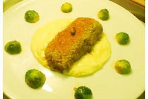 Filet d’agneau en croûte de pistaches, mousseline de pommes de terre au raifort et choux de Bruxelles