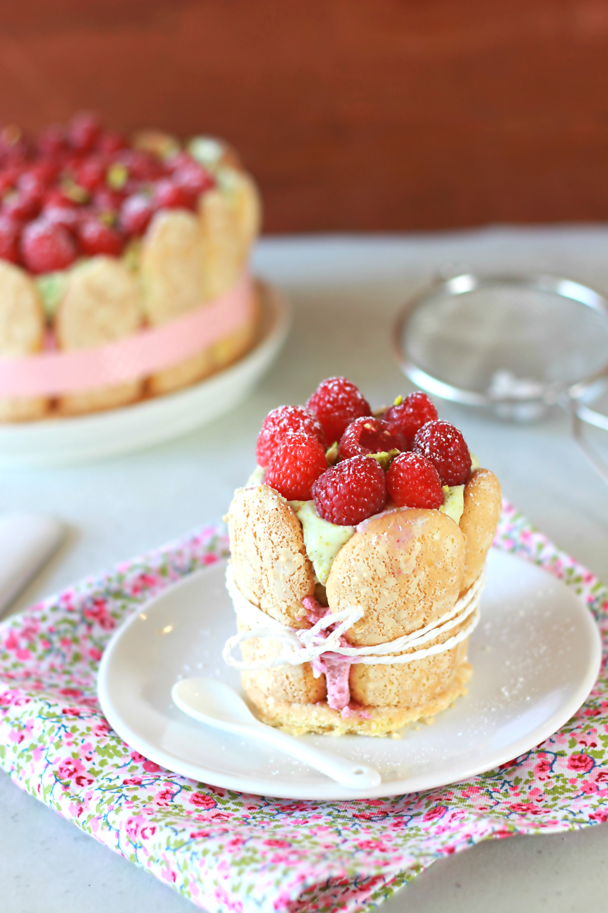 Charlotte à la mousse de framboises et chantilly à la pistache