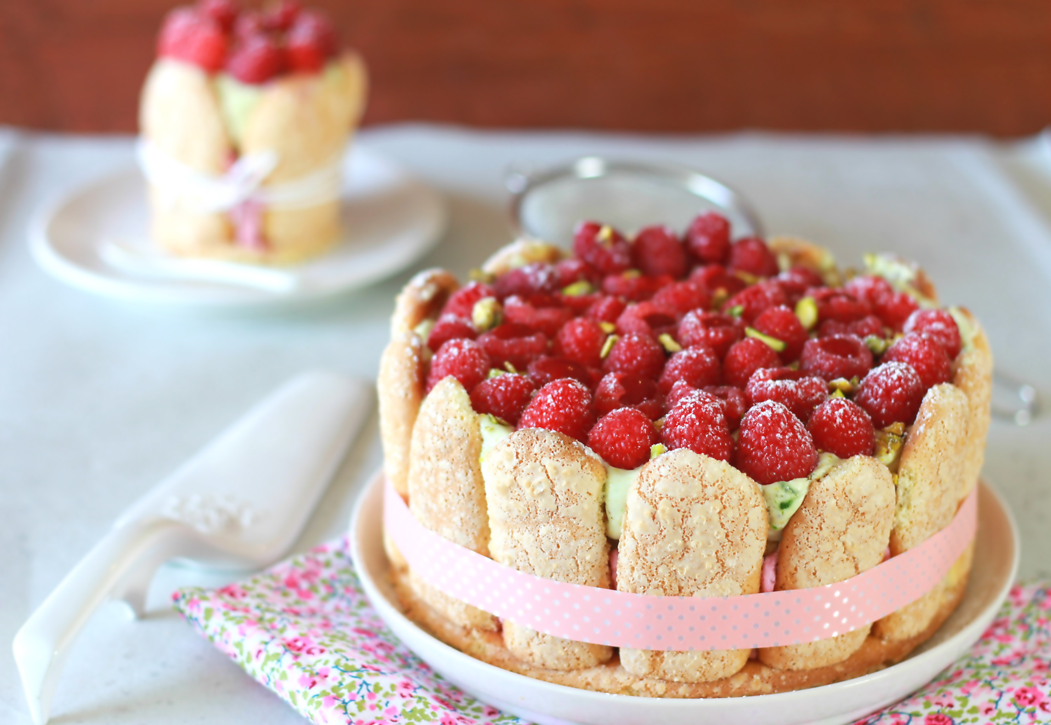 Charlotte à la mousse de framboises et chantilly à la pistache