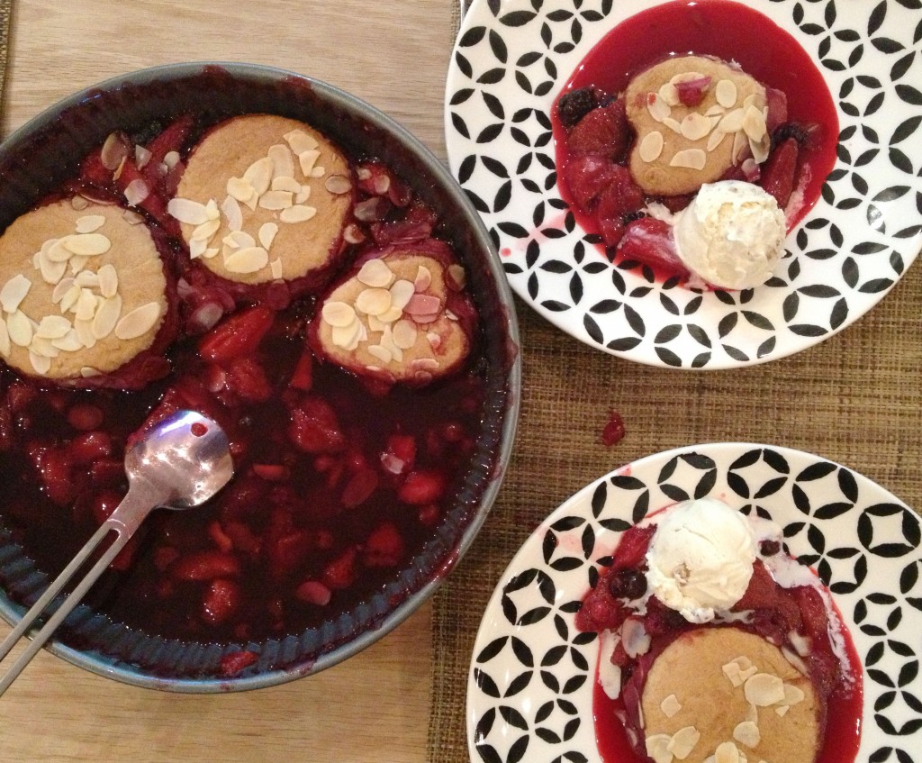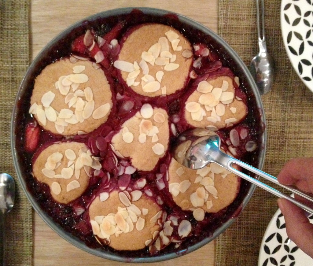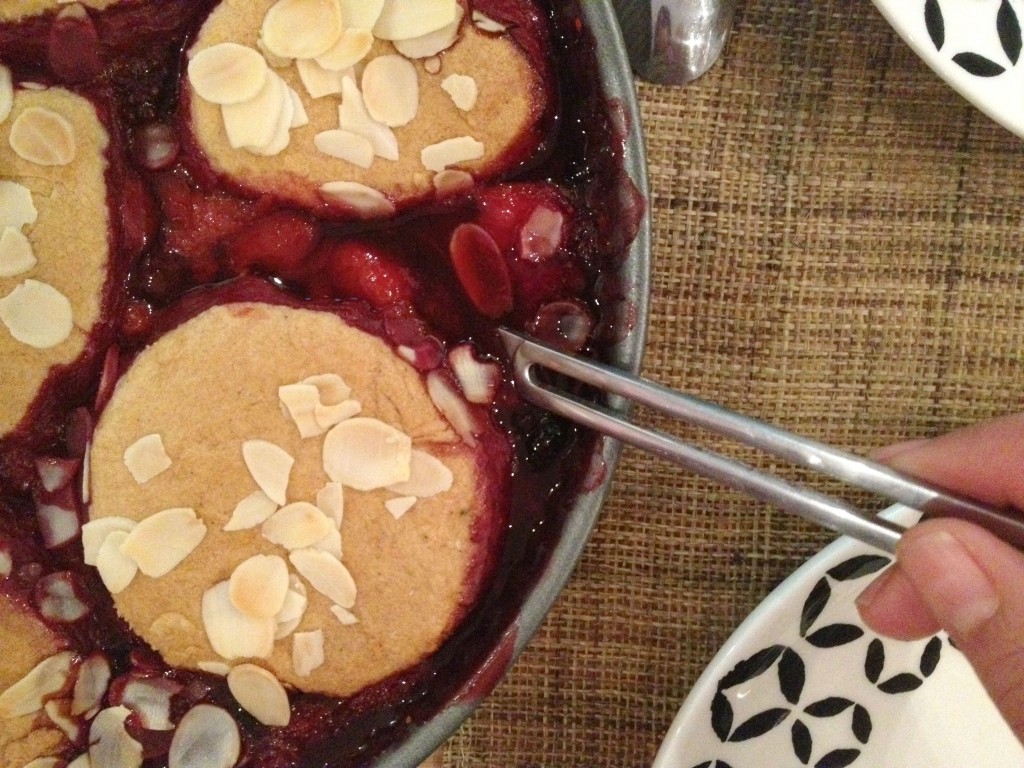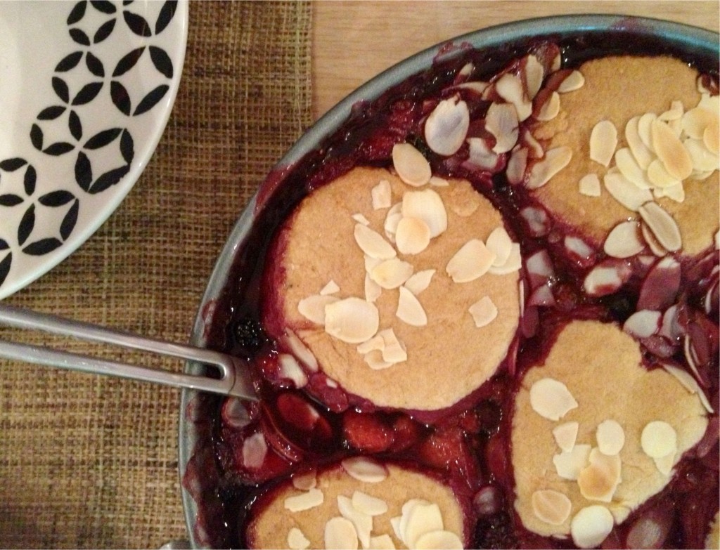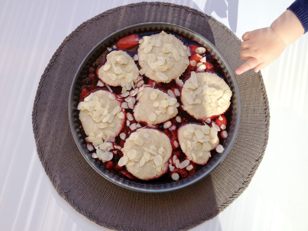 Cela faisait longtemps que je voulais réaliser un Cobbler, et bien c’est désormais chose faite et je ne suis pas déçue! Mais au fait, le cobbler, qu’est ce donc! De loin, il pourrait s’apparenter à un crumble puisqu’il s’agit également de fruits cuits au four, mais en lieu et place d’une pâte « sableuse » à crumble, le cobbler est supplanté par une sorte de pâte à biscuit fondante et onctueuse. En gros c’est une tuerie qui nous vient tout droit des Etats-Unis!