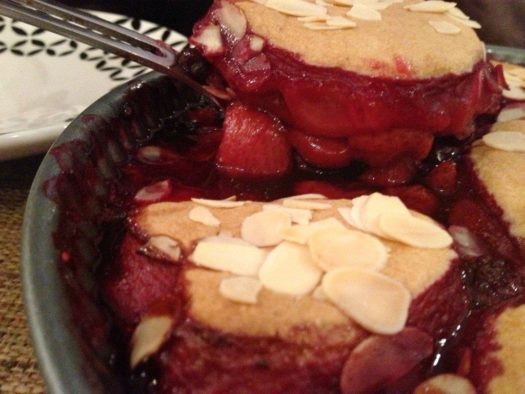 Le cobbler se déguste chaud avec une boule de glace. J’ai pour ma part cédé à de la glace vanille/pecan.