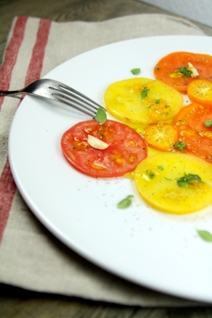 Si je vous dis green zebra, rose de Berne, noire de Crimée, ananas…vous me dites… tomates bien sûr. Et oui nous somme en pleine saison donc il faut en profiter. Je vous propose aujourd’hui une recette du très grand chef Eric Briffard tiré de son livre « Le Cinq » dont je vous avez parlé il y a quelques temps maintenant. Encore une fois, pas de chichi, c’est le produit qui parle dans cette recette. C’est vraiment une explosion de couleurs et de goûts qu’Eric Briffard nous propose au travers cette recette très estivale et rafraichissante. C’est l’occasion de (re)découvrir toutes ces variétés merveilleuses de tomates. Allez place à la recette.