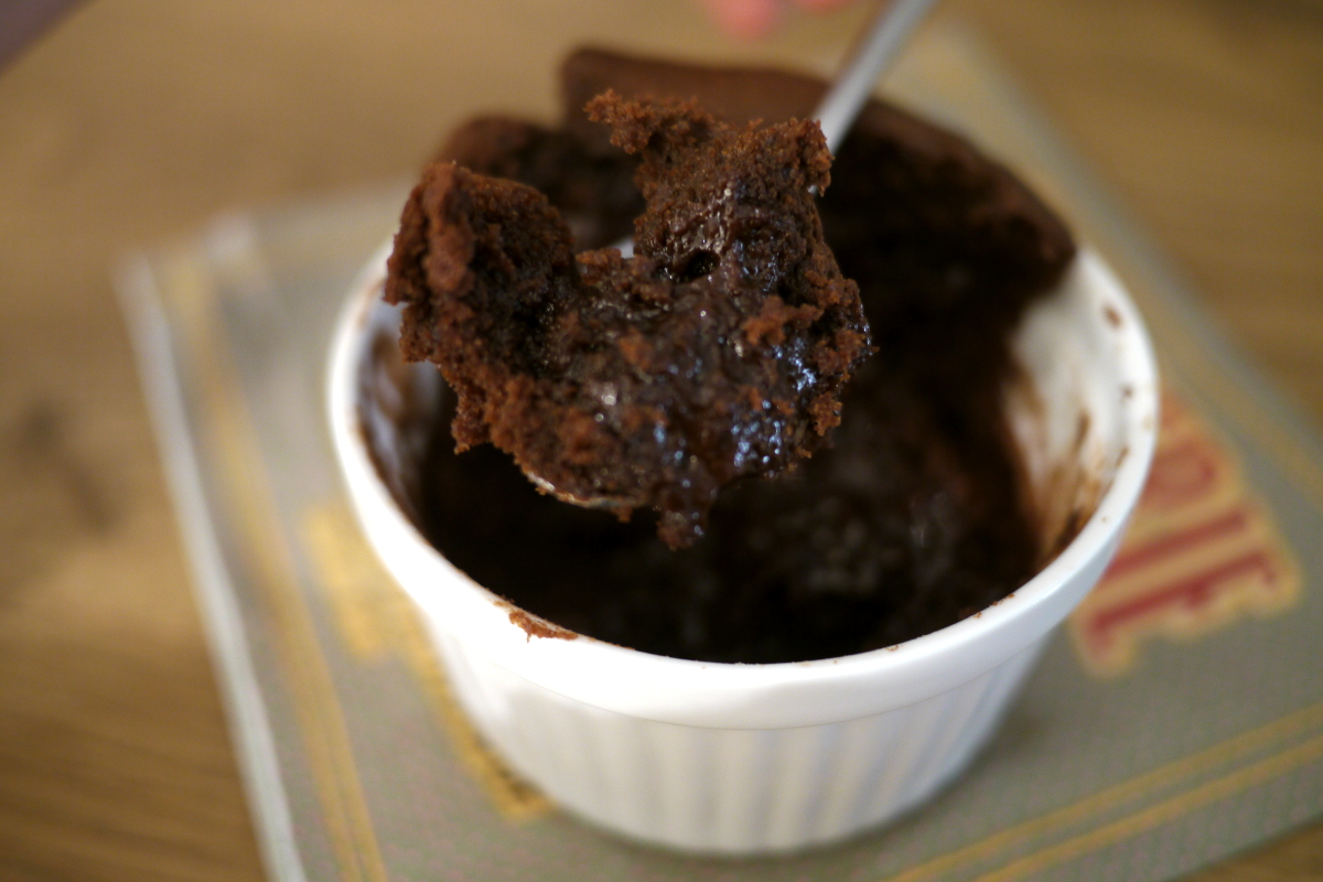 Préchauffez le four à 180°. Coupez le chocolat en morceaux et faites le fondre au bain-marie avec le beurre. Fouettez les œufs avec le sucre. Ajoutez le mélange chocolat-beurre tout en continuant de bien mélanger pour éviter que les œufs ne montent trop en température, puis incorporez la farine, la levure et la cannelle. Versez l’appareil dans 4 récipients et réservez 30 minutes au frais.