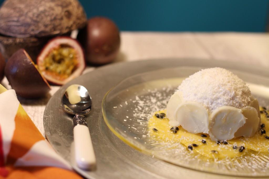 Ajoutez la gélatine essorée au lait de coco chaud hors du feu. Mélangez bien et ajoutez délicatement la crème chantilly à l’aide d’une maryse. Ajoutez enfin la noix de coco râpée. Réservez au frais.
