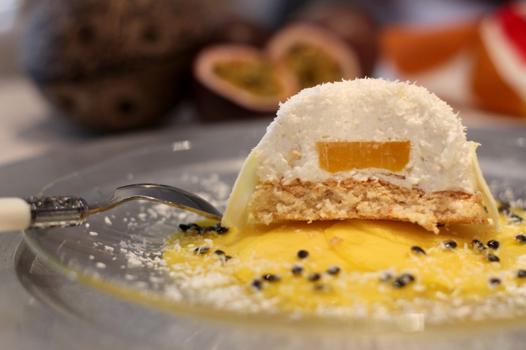 Donc me voici avec le thème noix de coco entre les mains et toutes les idées qui fusent jusqu’à arriver à la recette du jour! J’aime beaucoup associer la coco qui est très douce et sucrée au côté acidulé du fruit de la passion. J’ai rajouté une petite note fruitée supplémentaire avec ce carpaccio de mangue et un côté gourmandise avec cette dacquoise à la noix de coco qui est tout simplement à tomber par terre. Dur dur de ne pas la manger avant même de l’emportepiécer! Pour le dressage j’ai ajouté quelques feuilles de chocolat blanc même si je dois l’avouer je préfère largement l’alliance du chocolat noir avec la noix de coco.