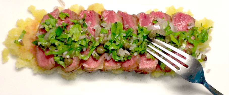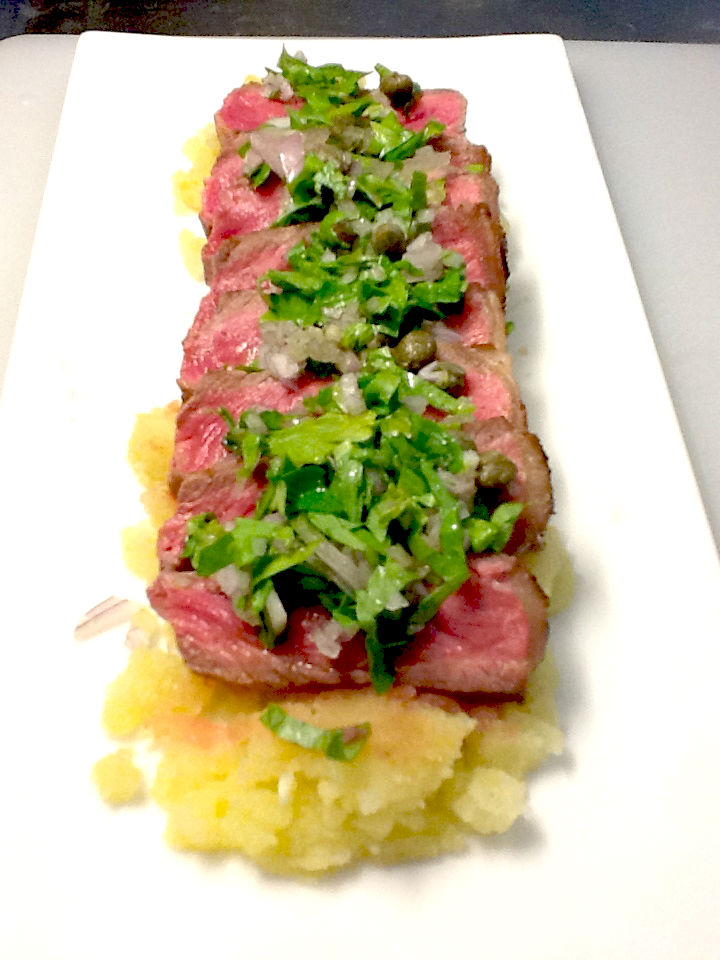 Découpez la viande en tranches que vous disposez avec la garniture (persil,échalotes,câpres) sur l’ecrasée. Arrosez le tout du petit jus rendu par la viande lors de son temps de repos. Vous pouvez rajouter un peu de fleur de sel et un tour de moulin à poivre. Servez puis dégustez immédiatement.