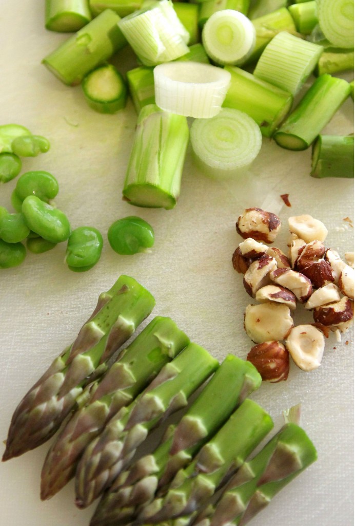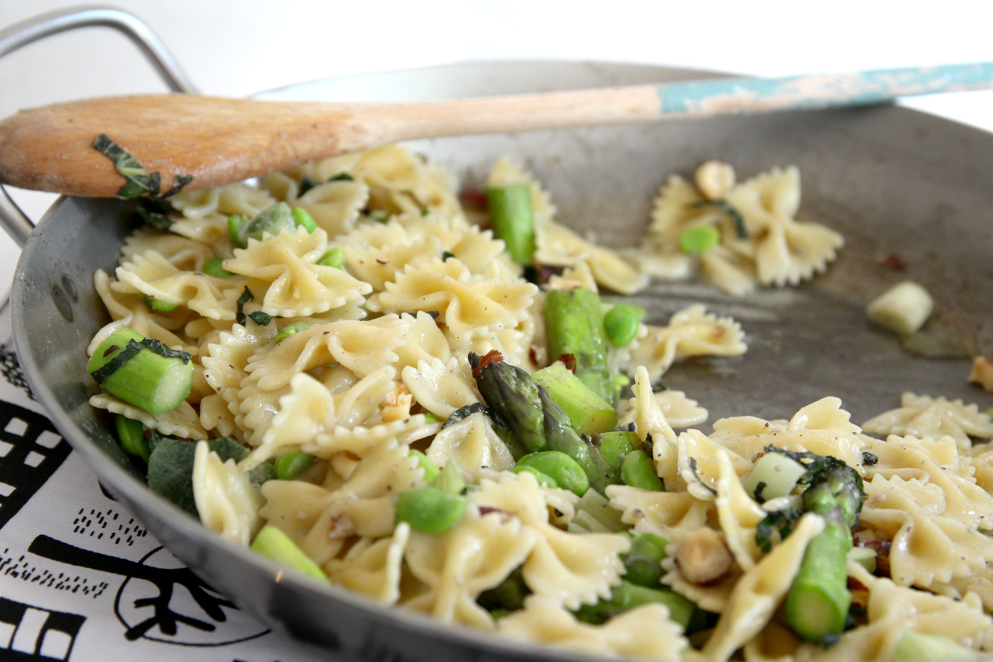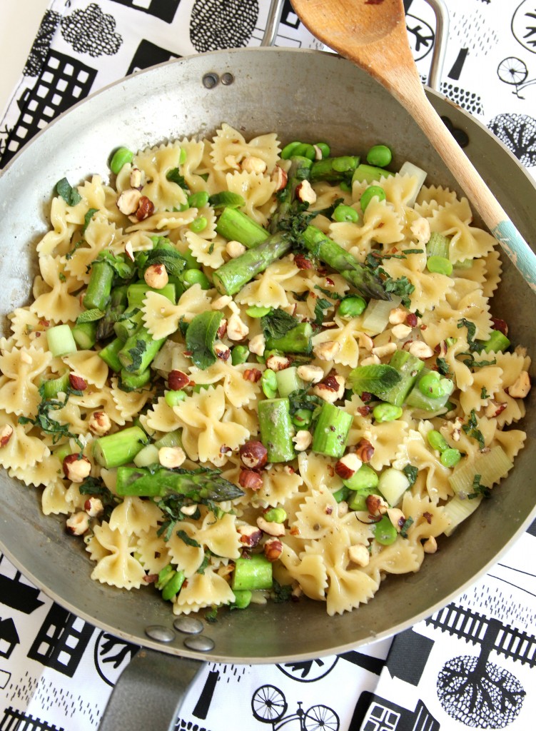 Ajoutez pour finir vos têtes d’asperges, les fèves, les noisettes et quelques feuilles de menthe. Ces ingrédients délicats vont cuire ou se réchauffer avec la chaleur résiduelle. Vos farfalle vont s’enrober du jus de cuisson résiduel (il doit en rester très peu) qui est gorgé de parfum et saveurs sur vos assiettes.