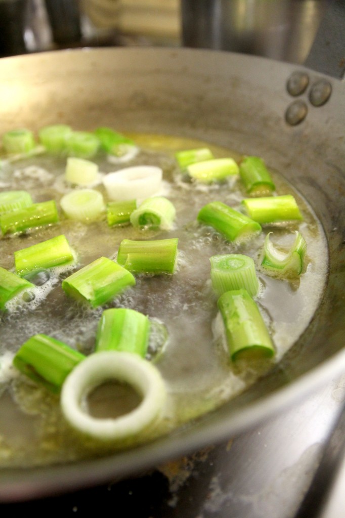 On s’ocuppe maintenant des asperges et des oignons nouveaux. Epluchez-les puis coupez-les en tronçons de 3cm environ (1 bouchée).On réserve pour la cuisson après.