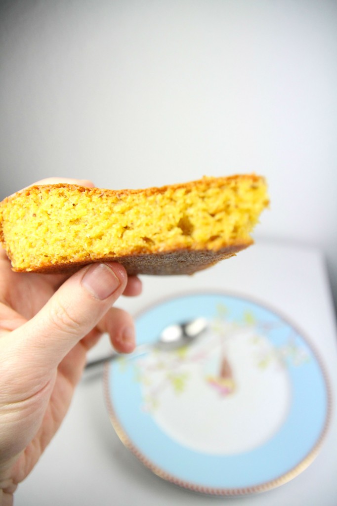 Versez la préparation dans le moule beurré et cuisez le tout pendant 55 minutes à 180°C. Malgré la présence de levure, ce n’est pas un gâteau qui gonfle beaucoup. Il a une texture presque croustillante à l’extérieur et bien moelleuse à l’intérieur…un régal.