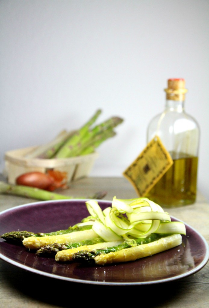 Et oui encore des asperges….il faut en profiter avant que ces belles demoiselles disparaissent de nos étales. Aujourd’hui je vous propose donc une belle recette de Romain Corbière, l’un des chefs de M. Alain Ducasse. Vous pourrez trouvez la vidéo de cette recette sur le site de femme actuelle. Tout comme notre précédente recette de ragoût d’asperges, celle-ci est simple, délicieuse et met le produit à l’honneur. Nous avons là une vrai déclinaison de saveurs et de textures avec de l’asperge crue, bouillie et poêlée…un vrai régal pour les papilles. Mettez vos tabliers, on commence maintenant.
