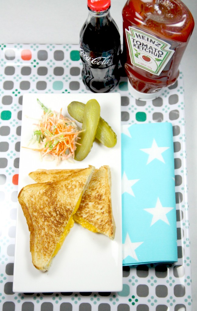 Coupez vos « grilled cheese » en 2 puis servez-les immédiatement avec des gros cornichons (pickles) et un peu de coleslaw, le tout arrosez de votre soda, limonade, bière… préféré…et voilà…we are in heaven!
