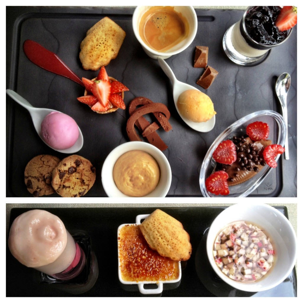 Café gourmand pantagruélique (panna cotta aux myrtilles sauvages, glace au malabar, guimauves, ganache au chocolat, émulsion au carambar…)