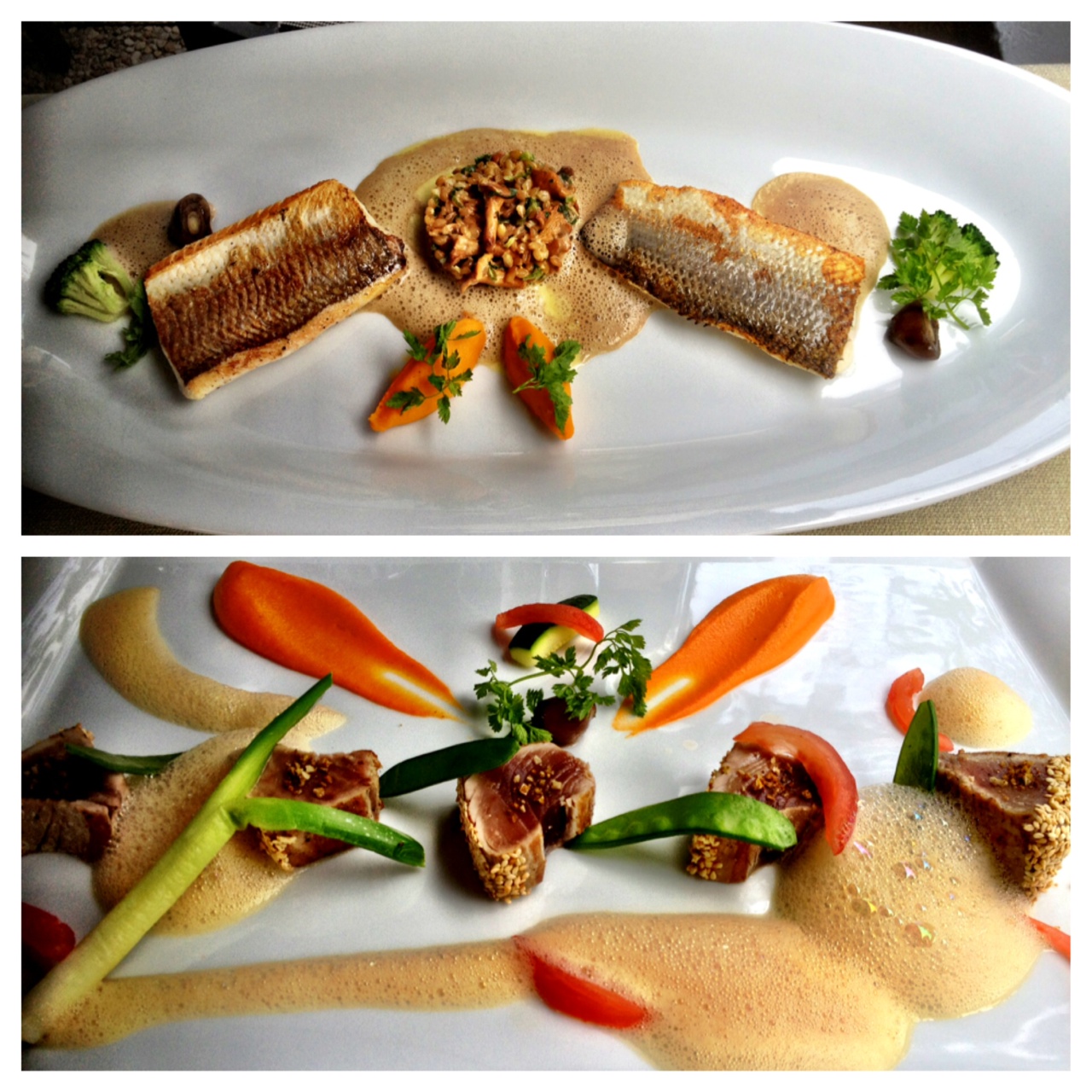 À lecture de la carte, notre choix se porta sur la féra (salmonidé de lac) et la bonite (thonidé de Méditerranée), suivie d’une variation autour de la pêche et d’un café gourmand. Dès l’amuse bouche, un bœuf carottes, nous rentrâmes dans le vif du sujet. Lorsque les plats arrivèrent nous fûmes surpris par la taille des assiettes (environ 40cm) et le graphisme que les chefs avaient réalisé. Les cuissons étaient justes (bonite rosée et féra nacrée), les assaisonnements subtiles et les assemblages équilibrés.