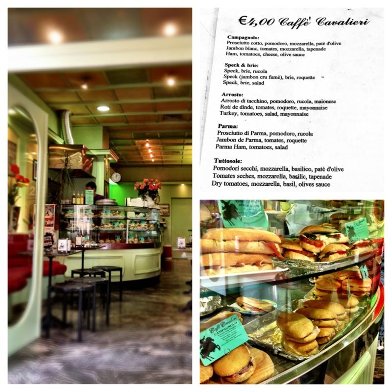 Après le marché, on cherche toujours un endroit pour manger un petit bout sans y passer des heures et sans se ruiner ! Nous avons pris l’habitude d’aller au Caffè Cavalieri, un petit bar à deux pas du marché via Roma. La carte n’est constituée que de paninis. Les assemblages sont typiquement italiens, on trouve du jambon cuit, jambon cru, speck (jambon sec et légèrement fumé du nord du pays), gorgonzola dans des sandwichs simples et bons. Ma préférence va vers les Boscaiolo et Gustoso, que je vous laisse découvrir si vous avez l’envie de faire un tour dans ce petit bar. Pour les bons mangeurs, prévoir 2 panini. Comme souvent en Italie, l’espresso est excellent alors n’hésitez pas à en prendre un pour finir votre repas. Vous sortirez légers pour profiter encore un peu de cette ville.