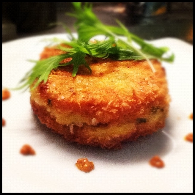 Pour ma part j’ai laissé la préparation au congélateur pendant 45 min puis j’ai mis du film alimentaire dans un cercle à pâtisserie dans lequel j’ai formé mes crab cakes. J’en ai dégusté un sur le moment que j’ai pané dans de la panure japonaise (« Panko ») et les autres « crab cakes » ont été congelé et utilisé plus tard dans la semaine.