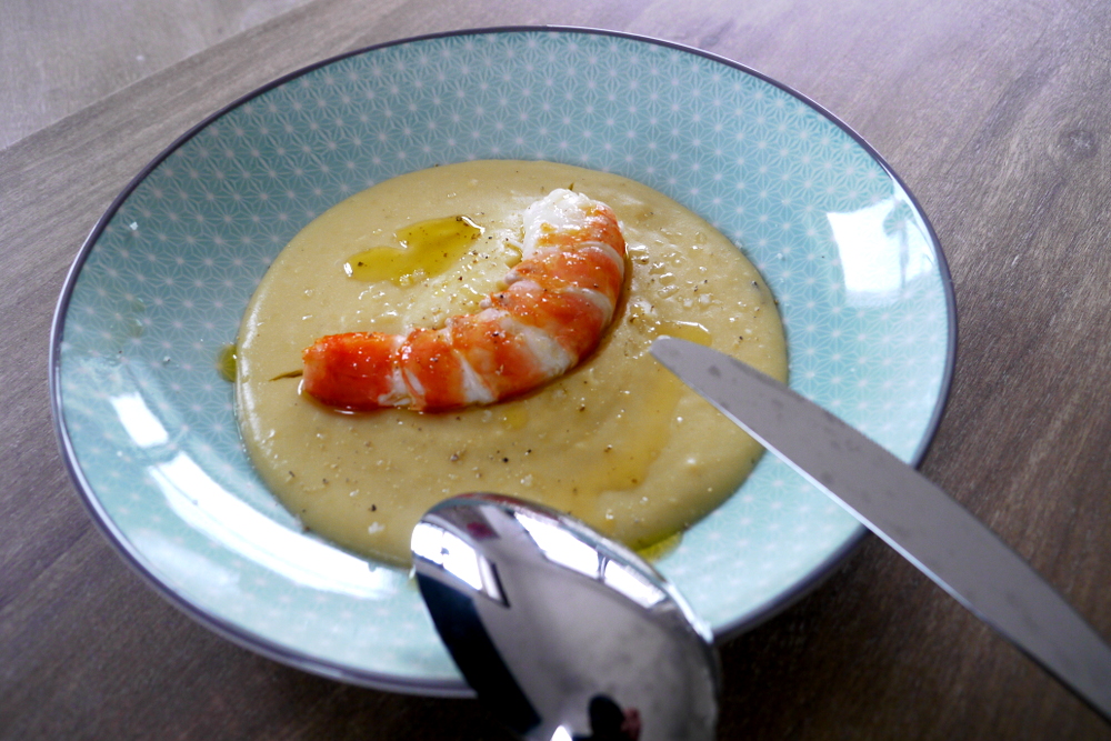Cette recette est inspirée d’un plat de Fluvio Pierangelini. A la lecture des ingrédients, je me suis dit qui l’association était osée et que ce mélange entre le crustacé et ce fabacée (légumineuse) paraissait particulier. Et bien en fait pas du tout, ça marche fantastiquement bien!! A la place d’une purée de pois chiche de la recette originale, je vous propose une minestra di cecci qui est une sorte de soupe toscane à base de farine de pois chiche. Pour les besoins de la recette je mets moins d’eau que traditionnellement afin d’avoir une préparation plus épaisse.