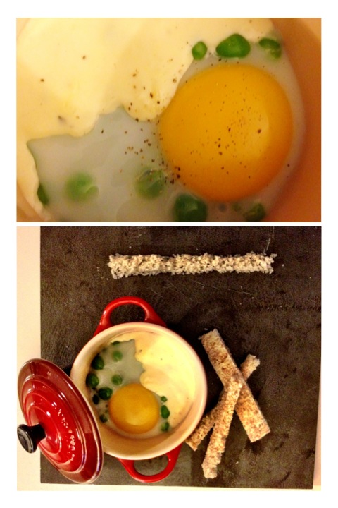 Plongez les petits pois 1 minute dans l’eau frémissante et salée. Pendant ce temps beurrez deux ramequins d’une dizaine de cm de diamètre. Égouttez les petits pois, répartissez les dans les ramequins afin d’en recouvrir le fond. Cassez un œuf par ramequin et placez les environ 9 minutes au bain marie au four. Le temps de cuisson dépendra de la taille des œufs. Le jaune doit rester coulant, en sachant qu’avec l’inertie du ramequin, l’œuf continuera encore à cuire jusqu’au moment de la dégustation.