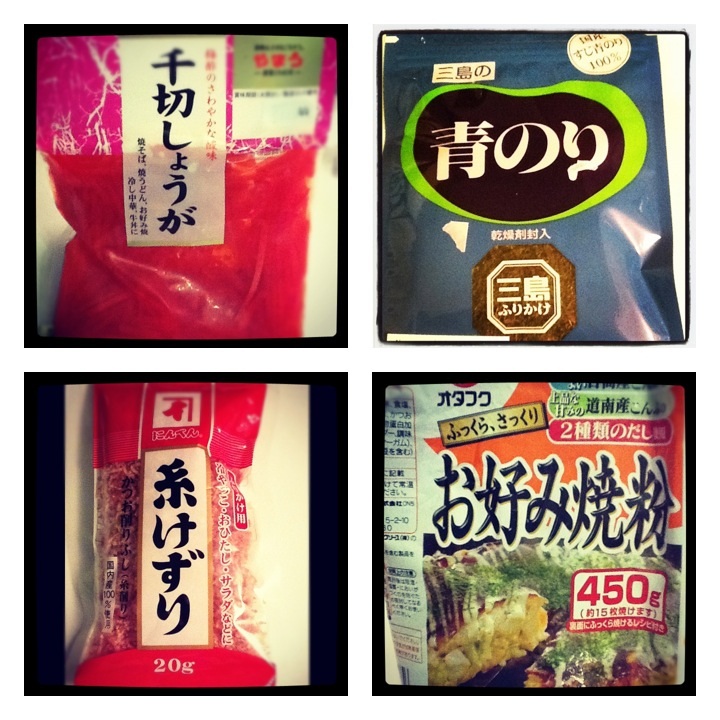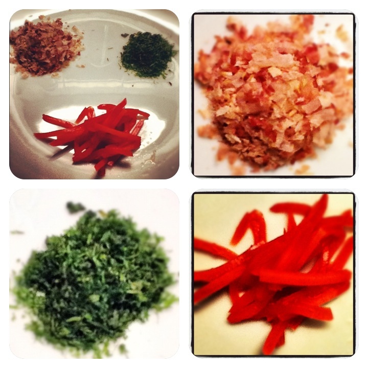 Pour finir parsemez le tout avec les katsuobushi, l’ao nori et le beni shoga.