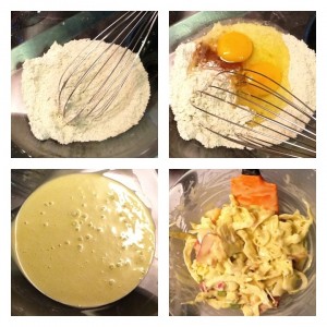Rajoutez vos garnitures, c’est-à-dire le chou et l’oignon. Mélangez pour bien incorporer la pâte à okonomiyaki aux ingrédients. Ne vous en faites surtout pas si vous pensez qu’il y a trop de garniture pour la quantité de pâte, c’est normal !