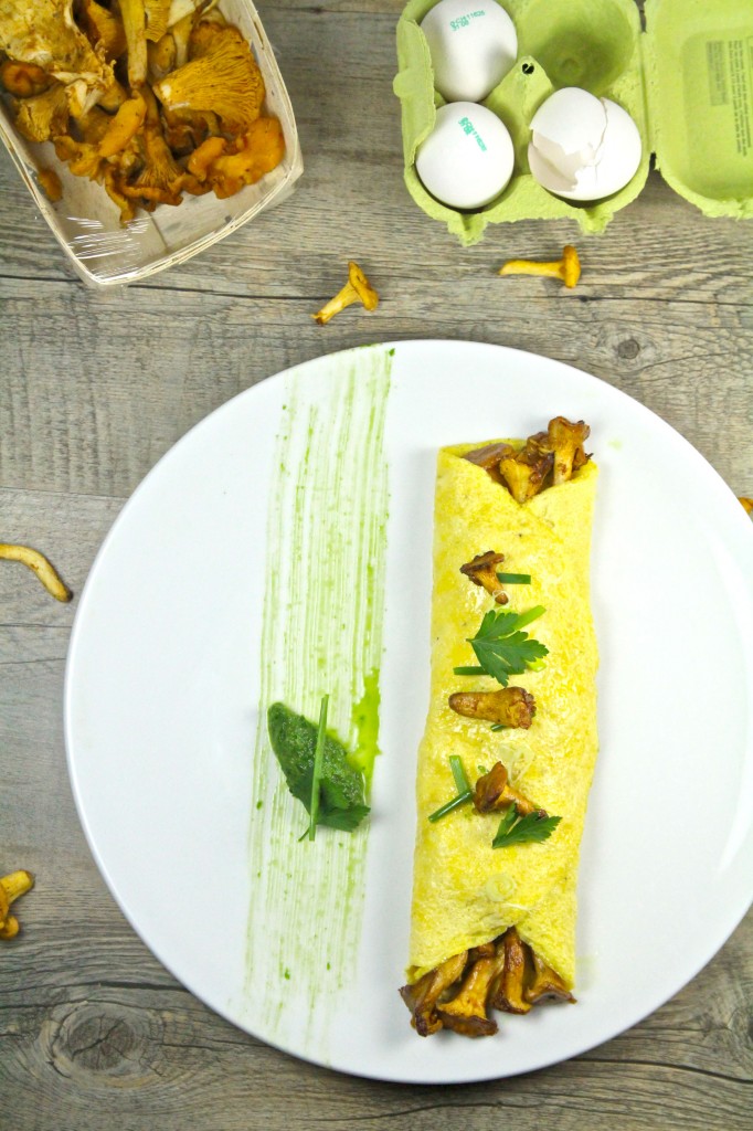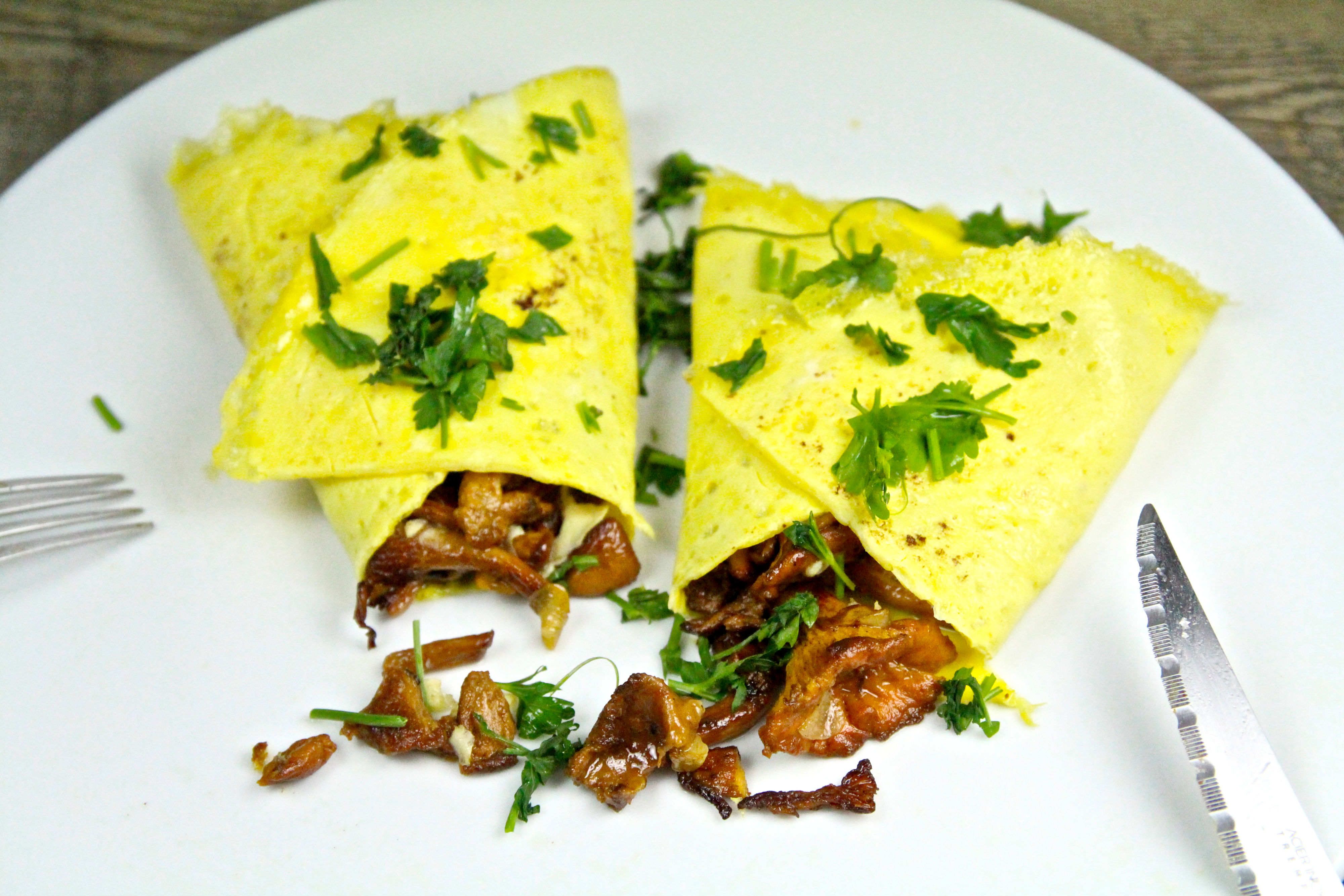 Sortez votre omelette et faites-la glisser dans une assiette. Si vous voyez qu’elle colle remettez-la un peu dans le four ou sur la plaque 1 minute. Ajoutez 1 grosse cuillère à soupe de chanterelles au centre de la crêpe et rabattez les 2 côtés afin d’emprisonner les chanterelles.