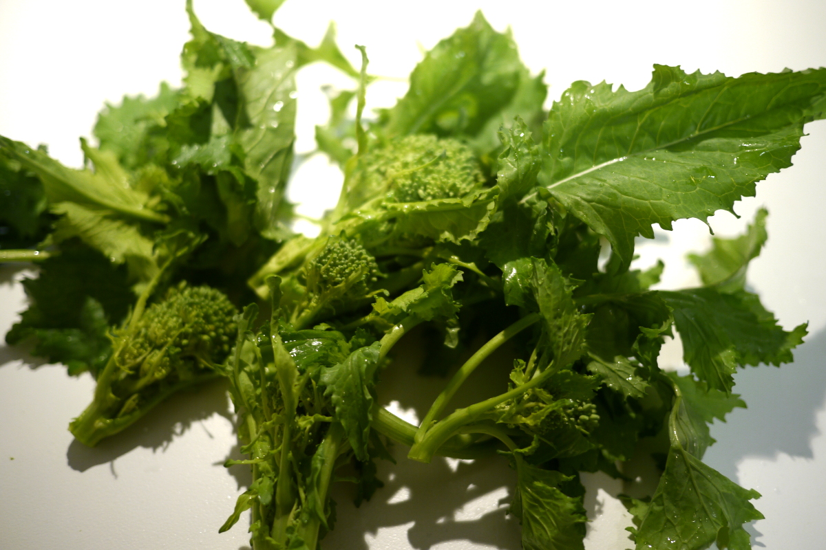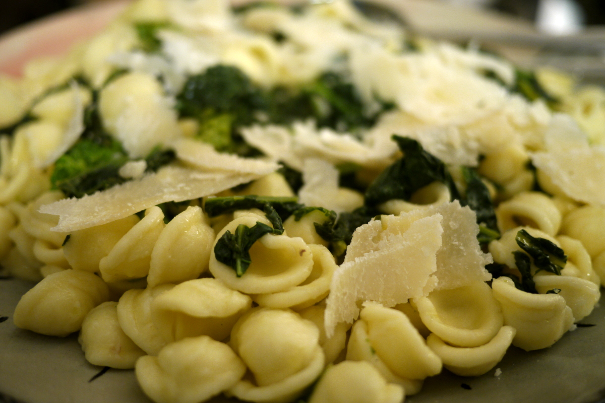 Rien que ce titre nous mène directement chez nos voisins transalpins jusqu’aux confins des Pouilles (talon de la botte). Dans cette recette de pâtes, on retrouve un ingrédient peu commun, les fameux « cime di rapa » (prononcé tchimé) qui sont les rejetons des navets. Cuits, ils développent une petite amertume plutôt agréable. Si vous n’en trouvez pas, vous pouvez facilement les remplacer par des pousses de brocolis, que j’appelle « brocolettes » (en général ça fait beaucoup rire).
