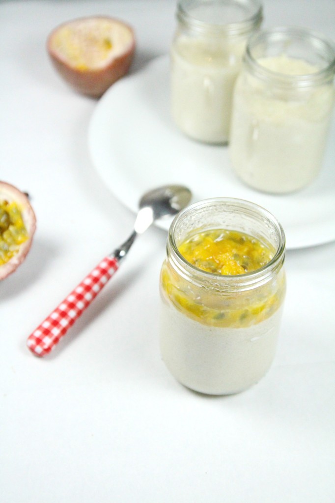 Au dernier moment sortez vos pots du frigo puis versez sur chacun d’eux le contenu d’1/2 fruit de la passion et dégustez!