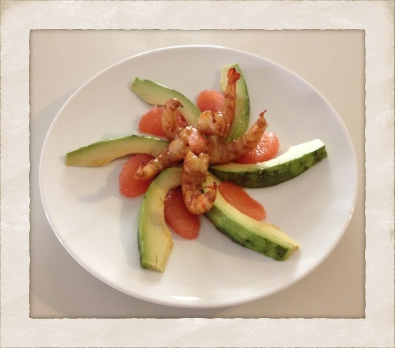 Alternez les quartiers d’avocat et les suprêmes de pamplemousse. Ajoutez les crevettes puis arrosez abondamment de la vinaigrette.