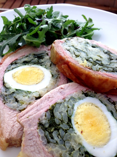 Tout d’abord, cuisez un œuf 7 minutes dans une eau en ébullition et le riz dans une eau salée. Lavez les blettes et émincez les finement. (Je ne m’embête pas à les blanchir; une fois le riz cuit et égoutté je l’étale sur mes blettes, la chaleur résiduelle les cuira délicatement). A part, mélangez ail et persil finement émincés, 2 œufs, chapelure, muscade et parmesan. Réunissez les 2 préparations pour former une farce homogène. Garnissez l’intérieur de la poche à moitié, placez l’œuf « dur » écalé au centre, puis complétez à nouveau avec la face. Ne la chargez pas de trop, la viande va légèrement rétrécir en cuisant. Recousez l’ouverture soigneusement.
