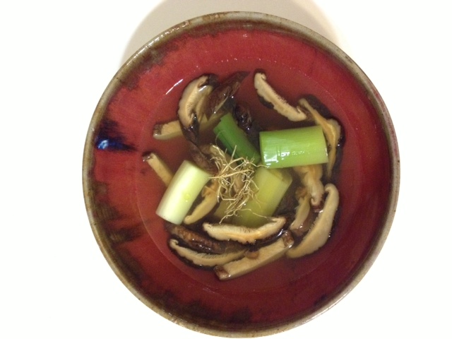 Dans un bol, placez les shiitakes au fond, puis les poireaux et versez délicatement le bouillon. Enfin, déposez les radicelles.