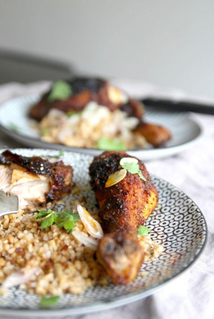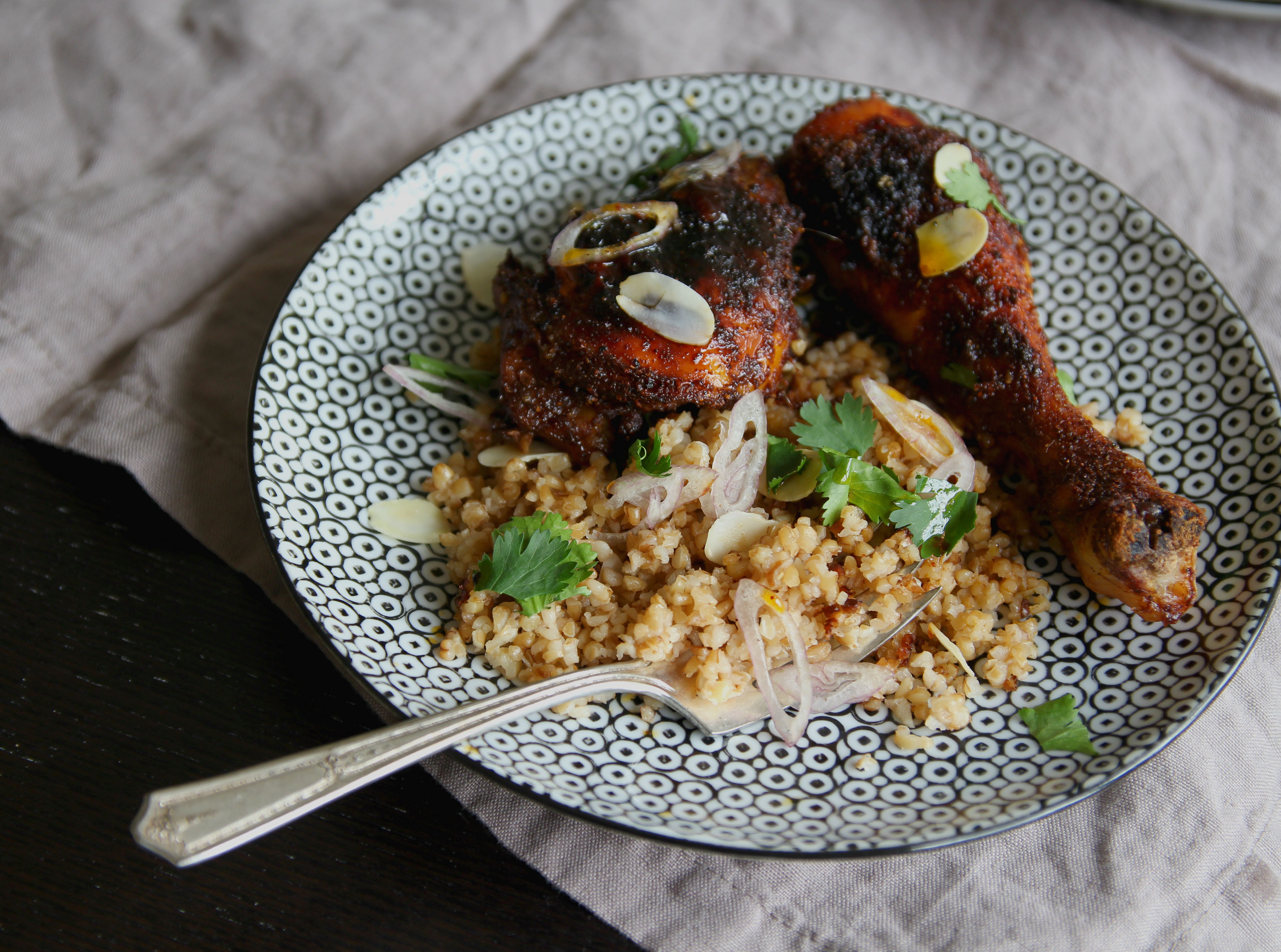 Sur chaque assiette disposez un peu de boulghour avec les 2 morceaux de chaque cuisse. Parsemez le tout d’échalote finement ciselée, d’amandes effilées (que vous pouvez torréfier), de coriandre fraîche et d’un trait de jus de citron vert. N’hésitez pas à rajouter un trait d’huile d’olive sur votre boulghour