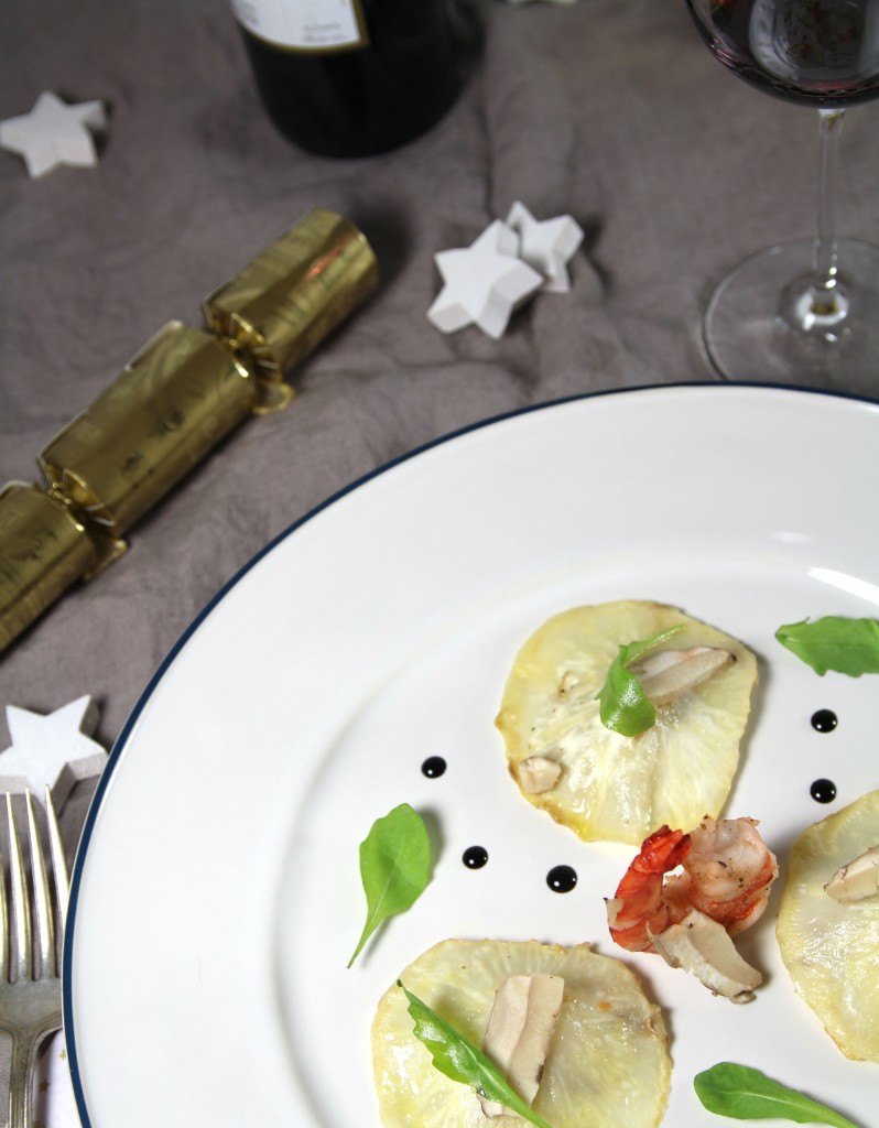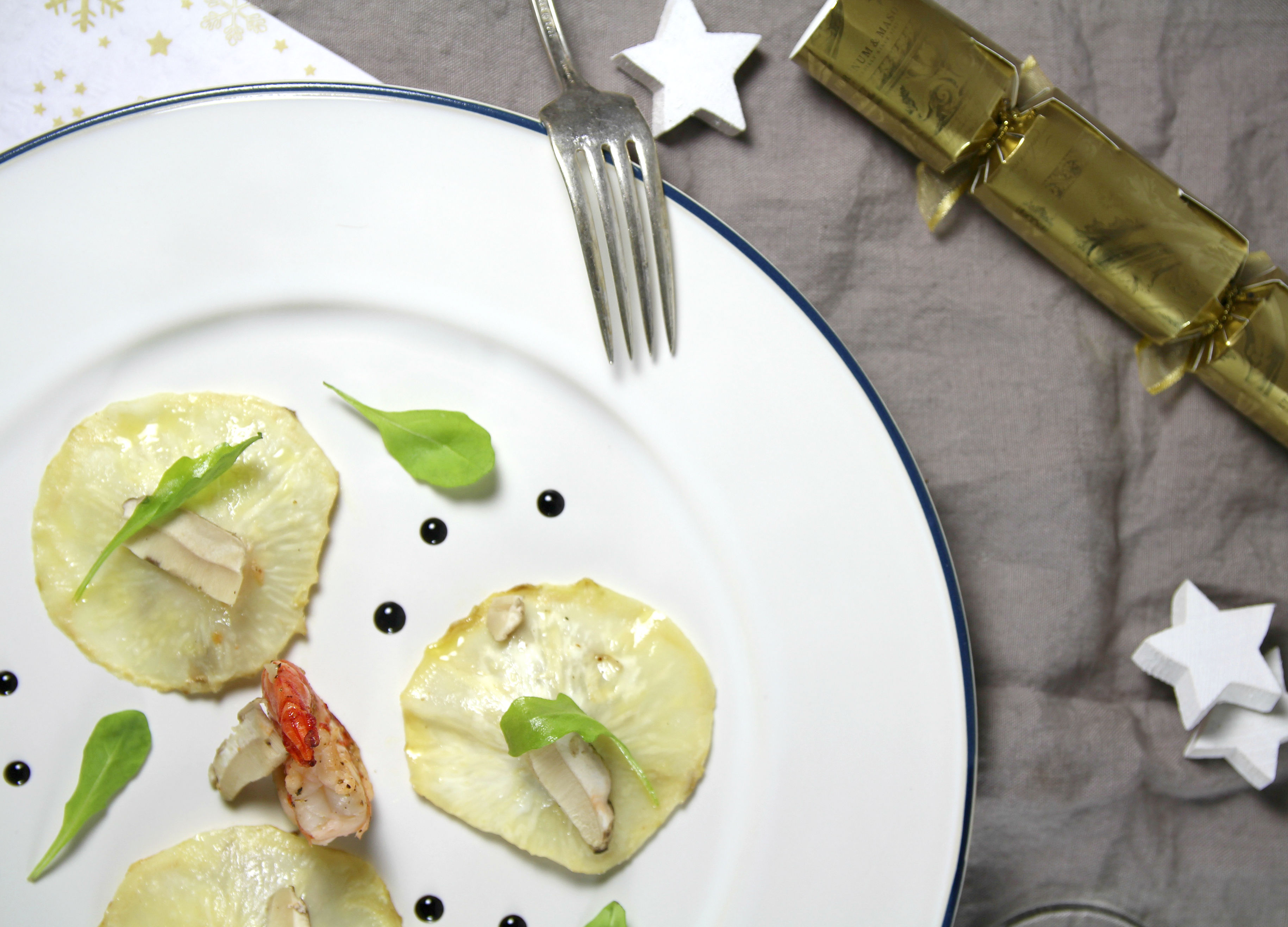 Voici une petite idée d’entrée pour les fêtes de fin d’année au cas où vous en auriez besoin. Il s’agit de ravioles ouvertes, car elles possèdent seuelement un seul côté, farcies de crevettes et cèpes. Vous pouvez remplacer les crevettes par des langoustines pour un met encore plus festif. Pour la pâte à raviole pas  de farine…j’utilise des lamelles de céleri comme dans la recette des ravioles à l’oseille. C’est une recette facile, originale et bien sûr goûteuse qui ravira vos convives. Régalez-vous les cookers!
