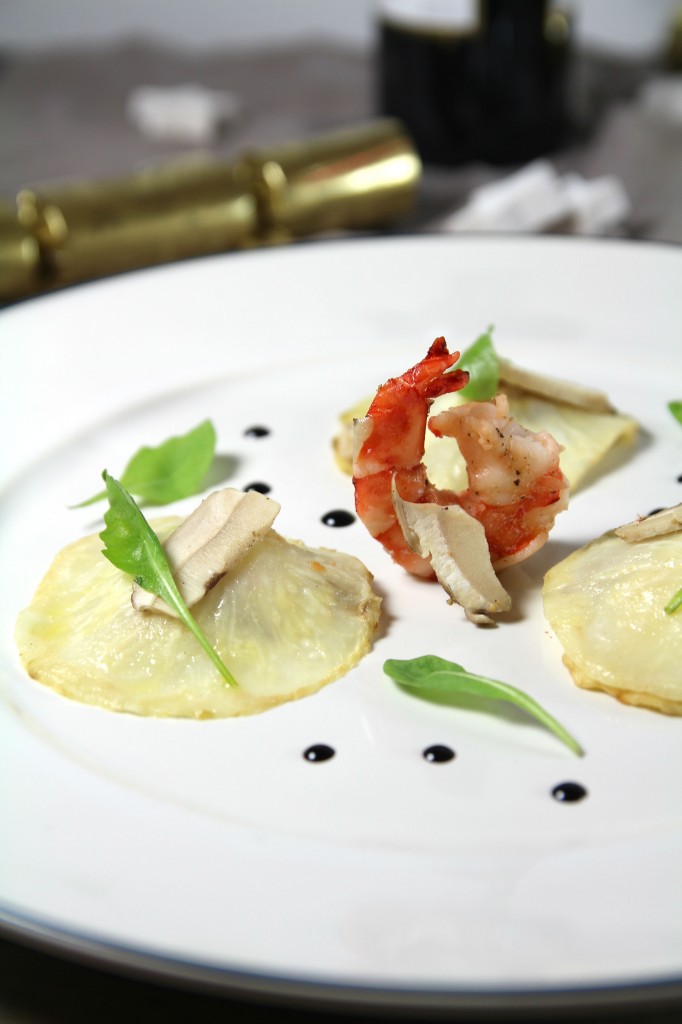 Rajoutez un peu de persil plat finement ciselé au mélange crevettes-champignons puis mélangez. Disposez trois petites cuillères à soupe séparées de ce mélange sur chaque assiette. Recouvrez ensuite ces petits tas d’une lamelle de céleri rave. Disposez une belle crevette au centre de l’assiette. Rajoutez un peu de fleur de sel et quelques tours de moulin à poivre.  En guise d’assaisonnement j’ai mis quelques points de réduction de vinaigre balsamique mais on pourrait  très bien faire une petite vinaigrette huile d’olive et jus de citron pour apporter un peu de peps.