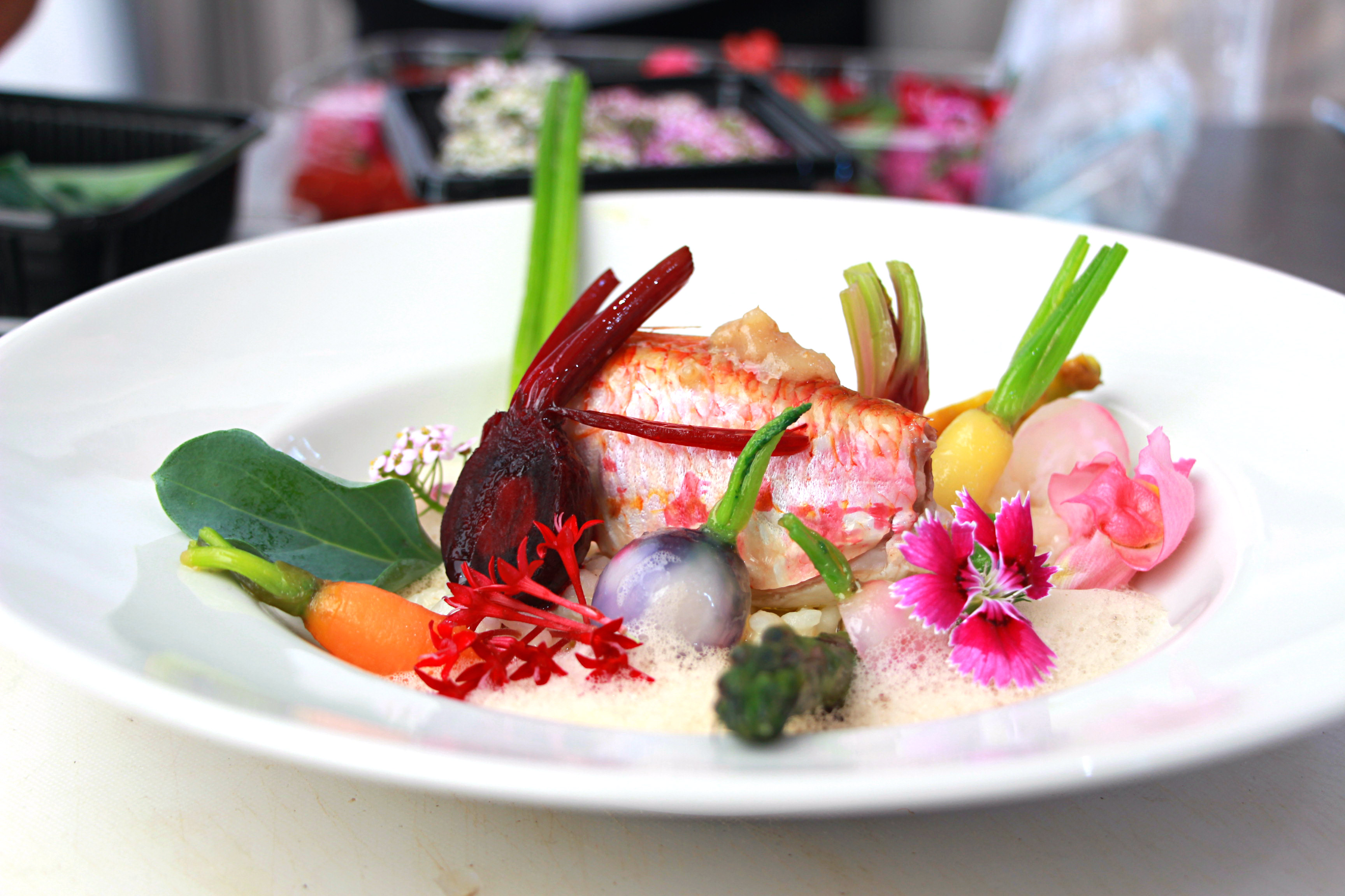 ← Rougets farcis, petits légumes glaçés à l’huile d’olive, risotto et émulsion de jus corsé (Chef CiCOGNOLA – Les étoiles de Mougins)