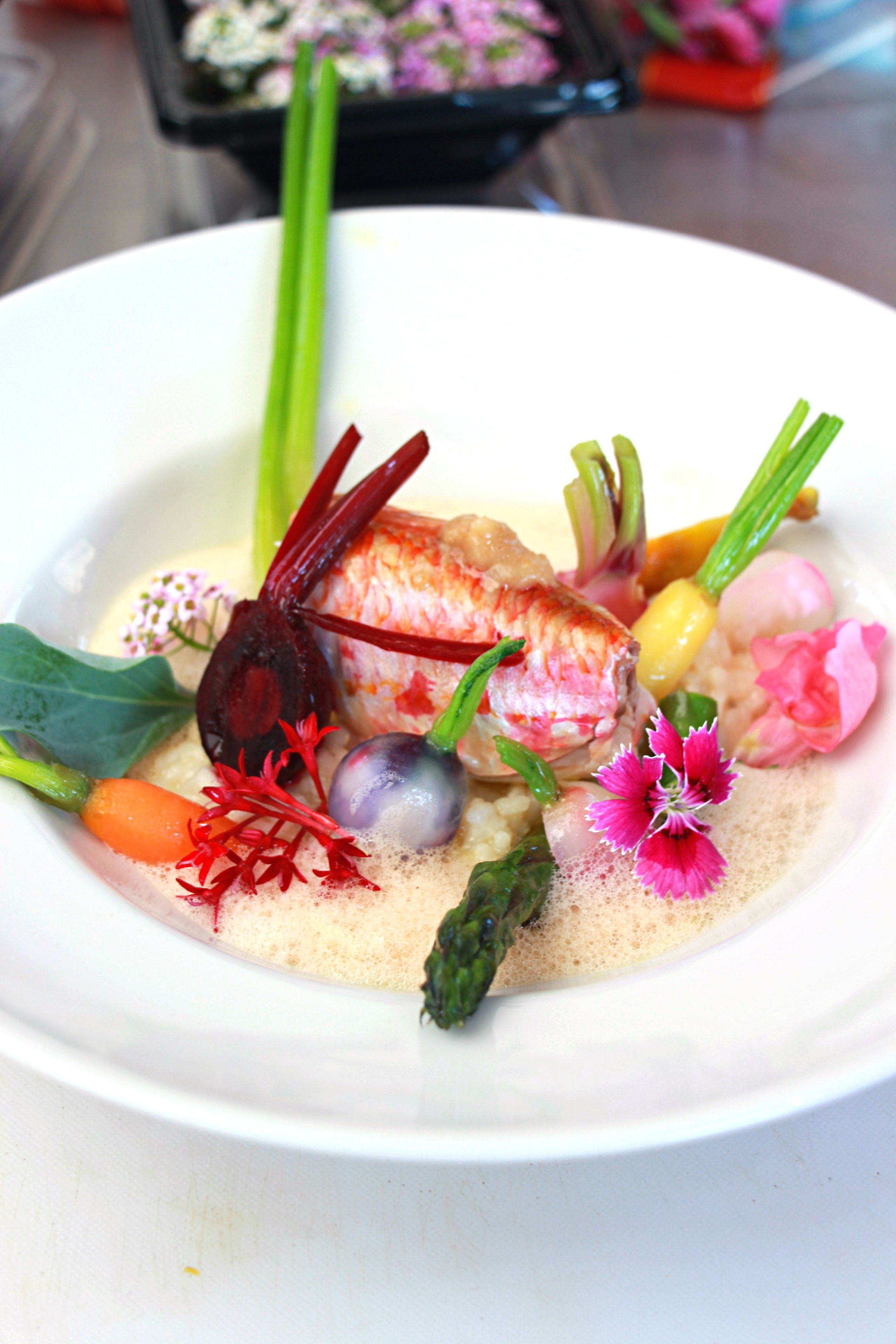 ← Rougets farcis, petits légumes glaçés à l’huile d’olive, risotto et émulsion de jus corsé (Chef CiCOGNOLA – Les étoiles de Mougins)
