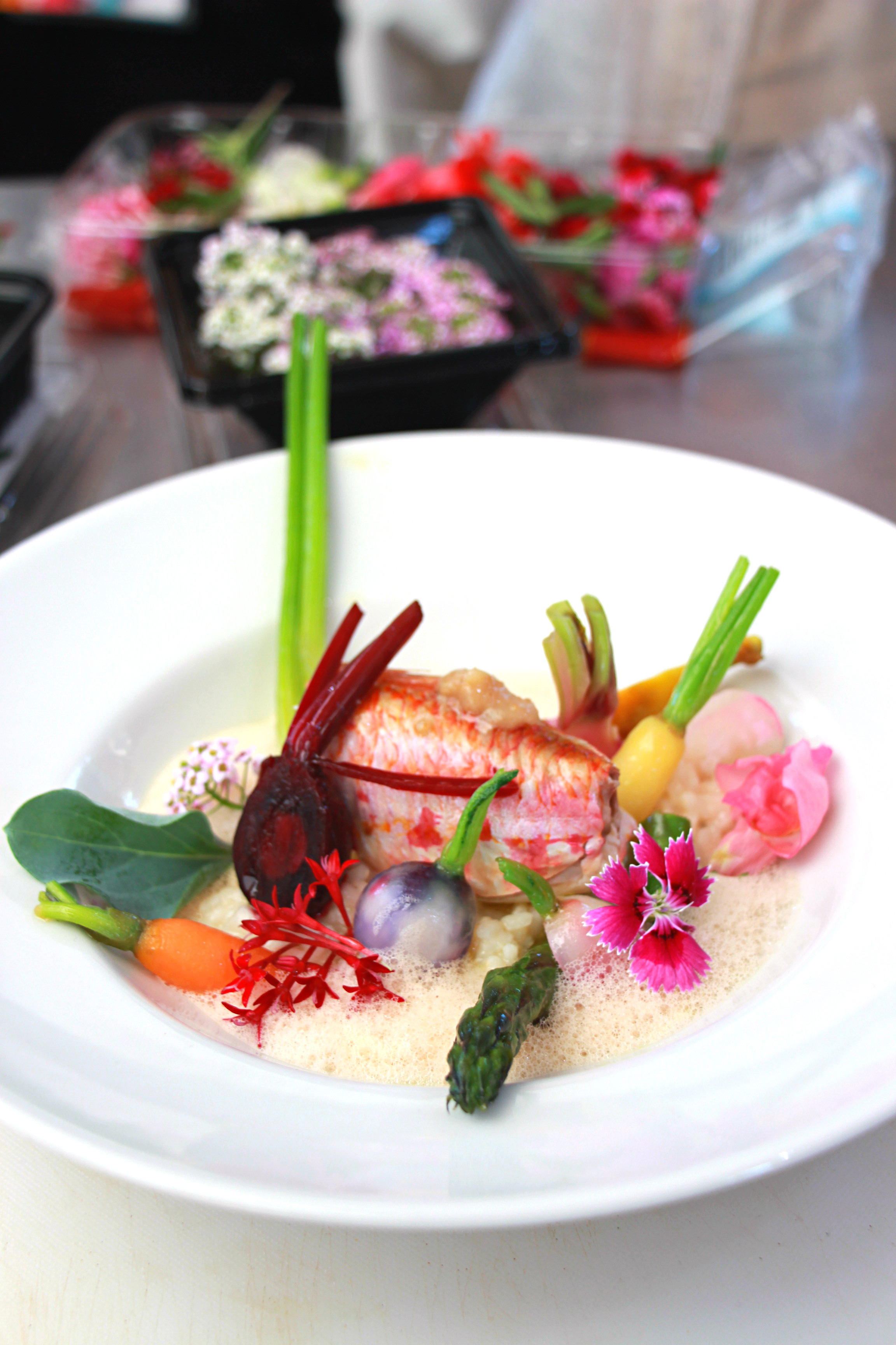 ← Rougets farcis, petits légumes glaçés à l’huile d’olive, risotto et émulsion de jus corsé (Chef CiCOGNOLA – Les étoiles de Mougins)