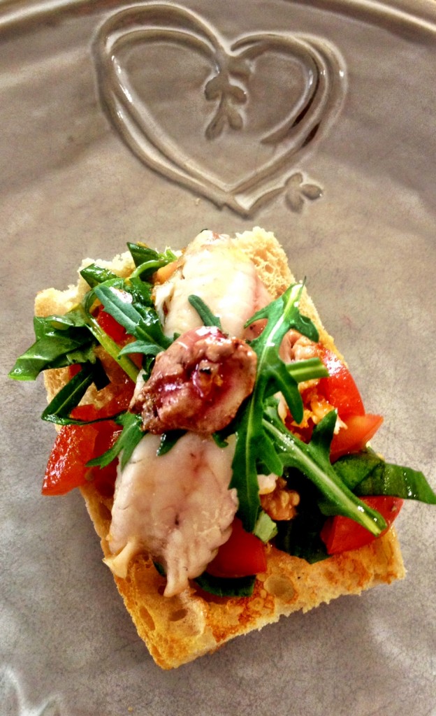 Dans une assiette, montez la tartine : tranche de pain encore tiède, 1cs du condiment de tomate, rouget, quelques brins de roquette et terminez par le foie (optionnel).
